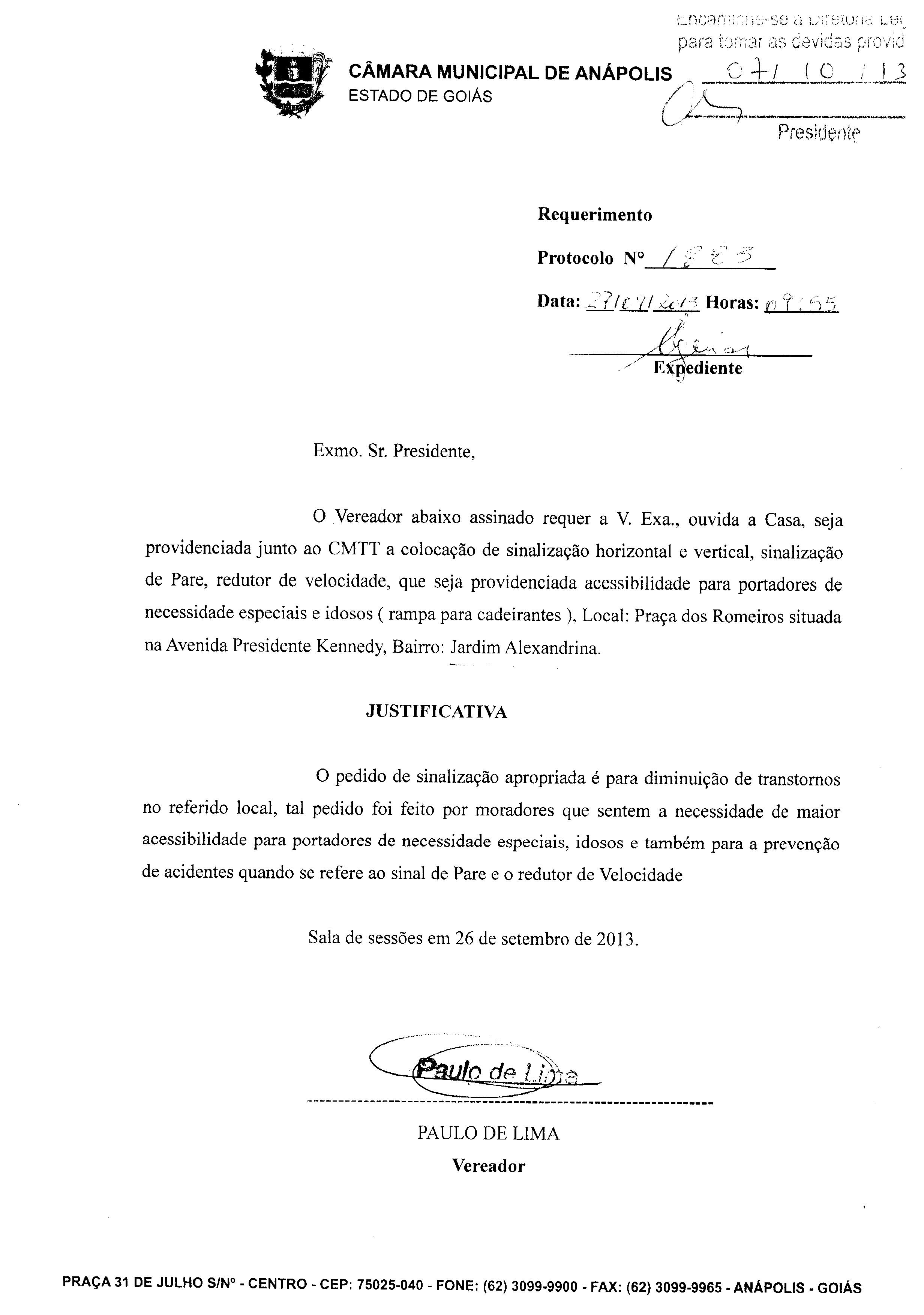 Ementa: À CMTT A COLOCAÇÃO DE SINALIZAÇÃO HORIZONTAL E VERTICAL, SINALIZAÇÃO DE PARE, REDUTOR DE VELOCIDADE, QUE SEJA PROVIDENCIADA ACESSIBILIDADE PARA PORTADORES DE NECESSIDADE ESPECIAIS E IDOSOS(RAMPA PARA CADEIRANTES), LOCAL: PRAÇA DOS ROMEIROS SITUADA NA AVENIDA PRESIDENTE KENNEDY, BAIRRO: JARDIM ALEXANDRINA.