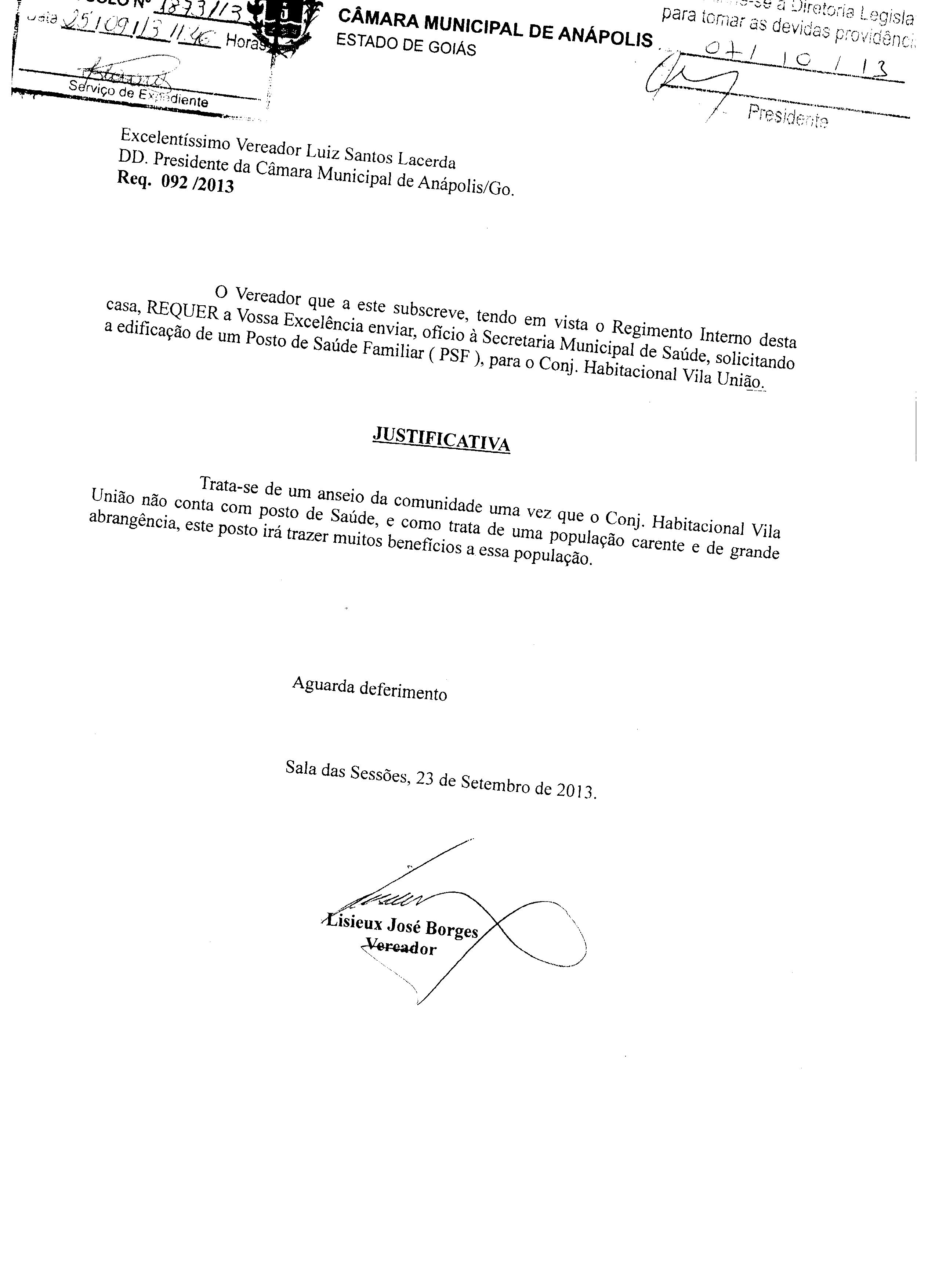 Ementa: À SECRETARIA MUNICIPAL DE SAÚDE, SOLICITANDO A EDIFICAÇÃO DE UM POSTO DE SAÚDE FAMILIAR (PSF), PARA O CONJ. HABITACIONAL VILA UNIÃO.