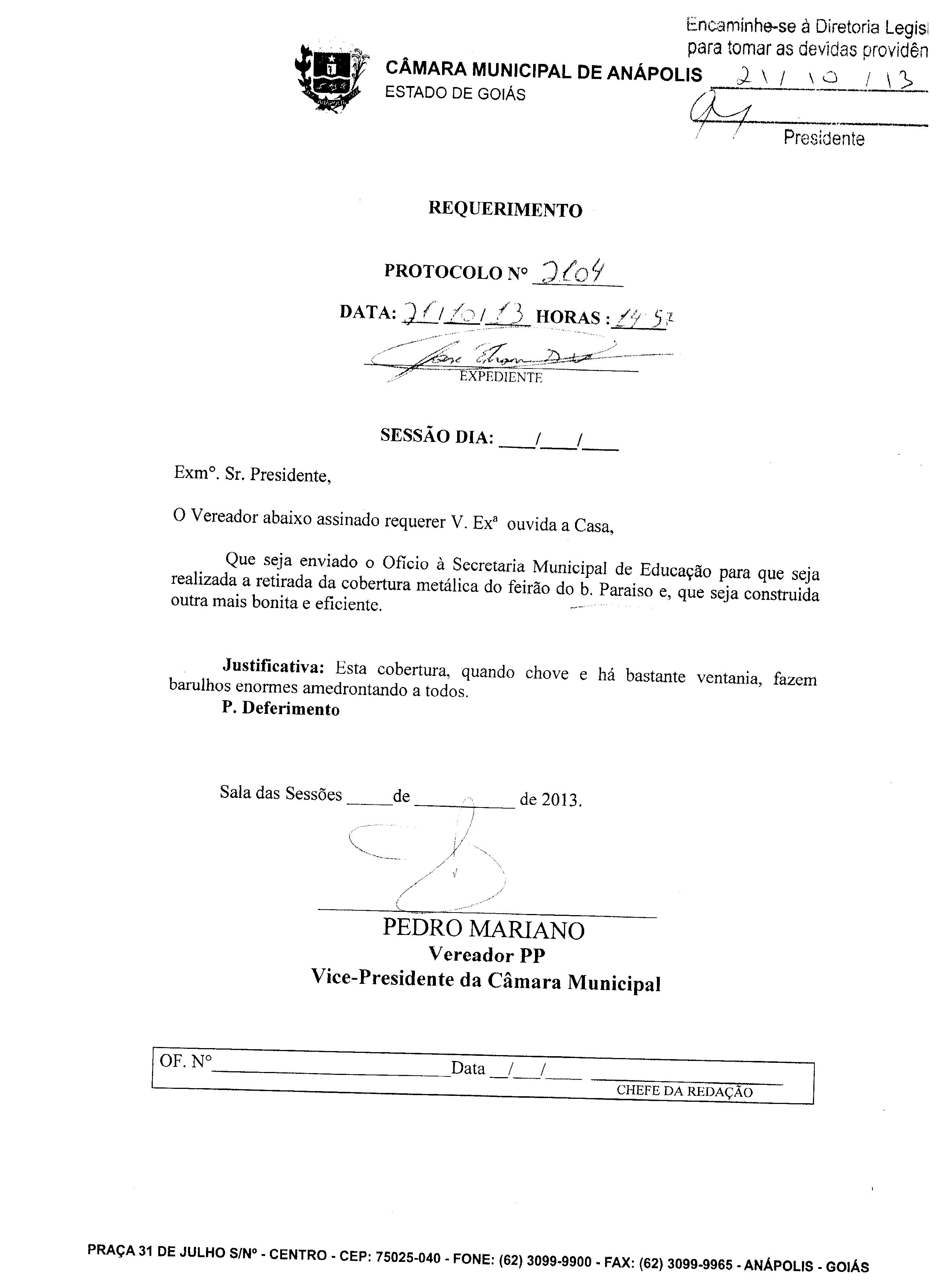 Ementa: À SECRETARIA MUNICIPAL DE EDUCAÇÃO PARA QUE SEJA REALIZADA A RETIRADA DA COBERTURA METÁLICA DO FEIRÃO DO BAIRRO PARAÍSO E QUE SEJA CONSTRUÍDA OUTRA MAIS BONITA E EFICIENTE.