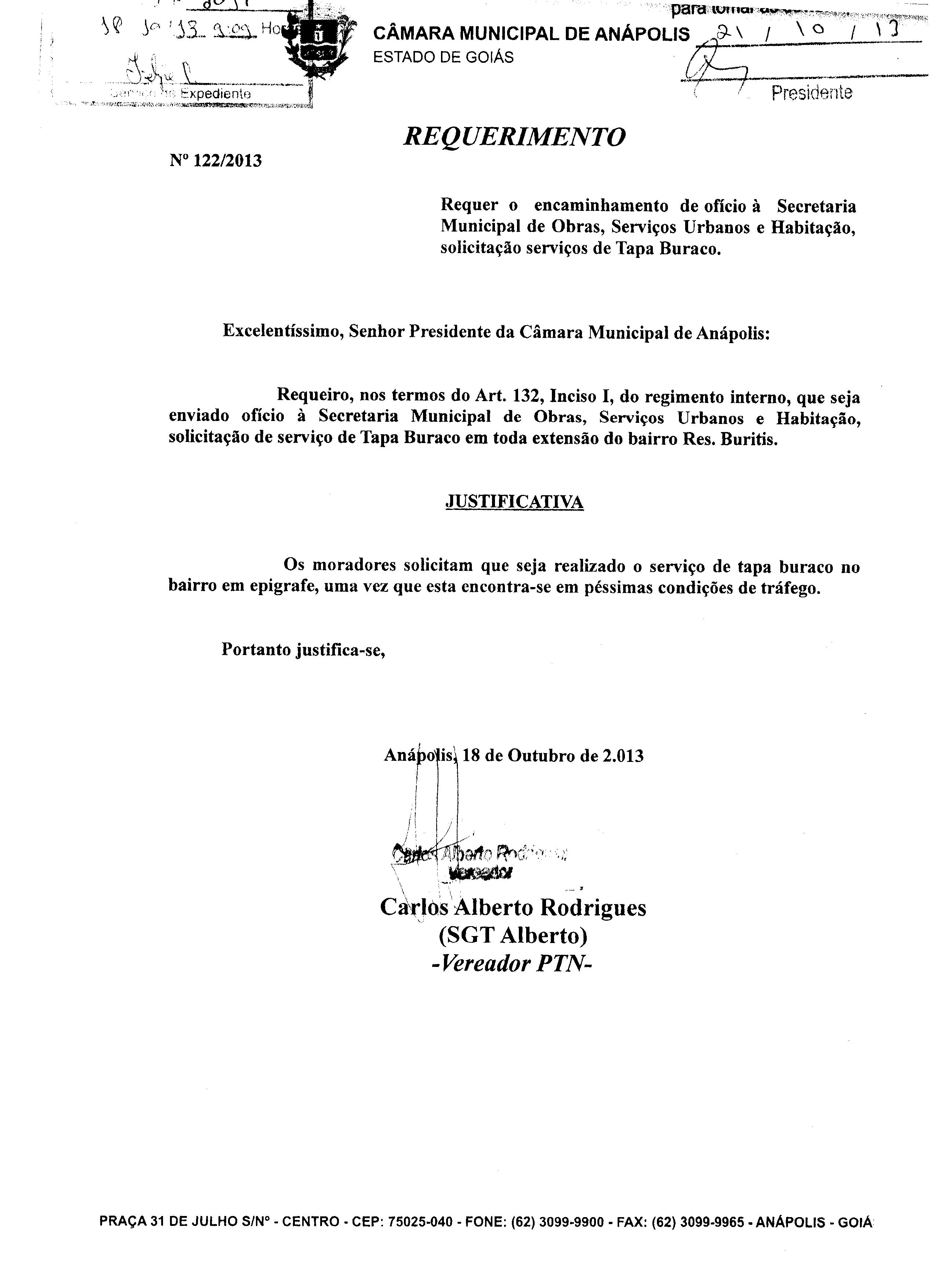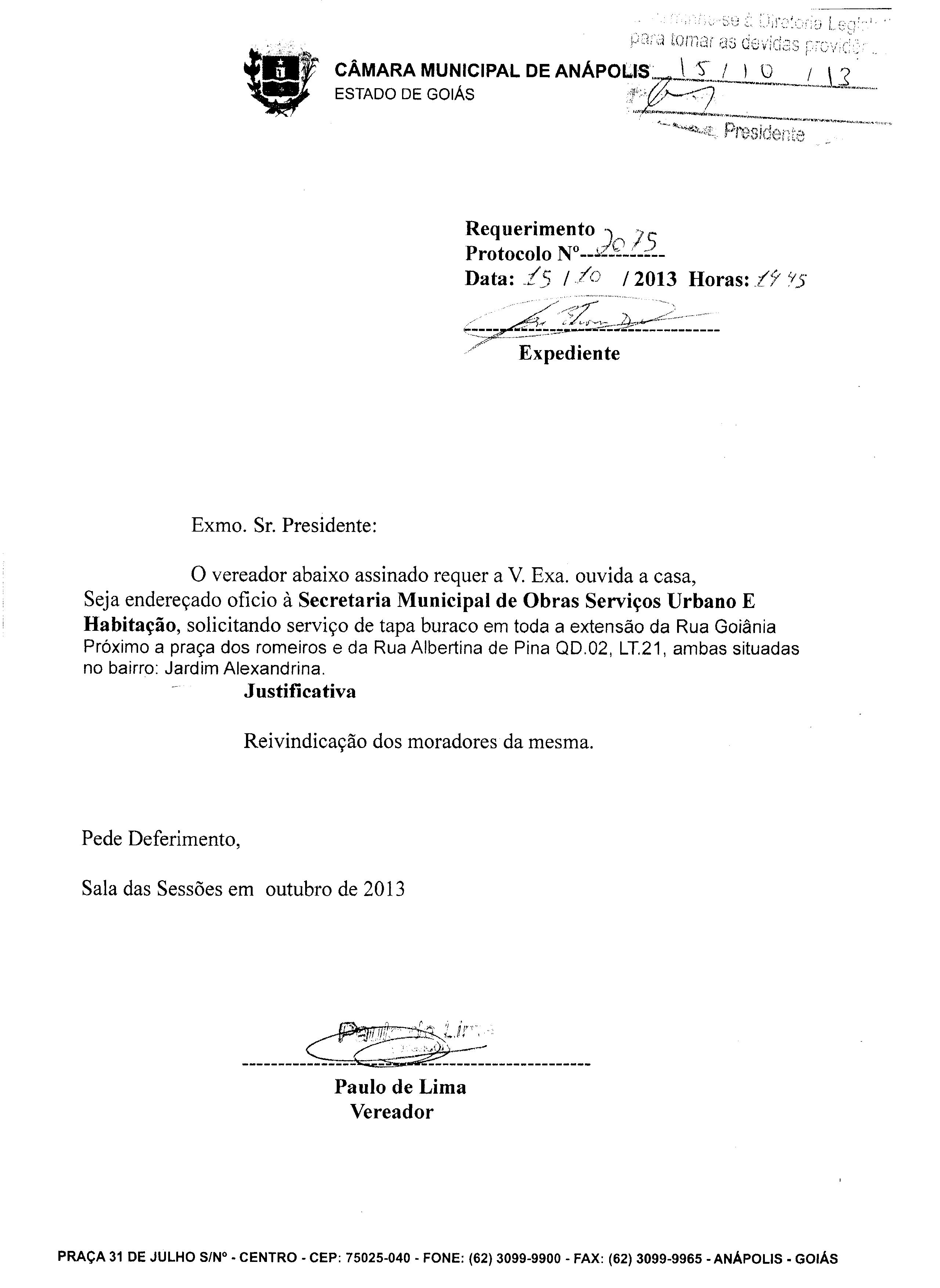Ementa: À SECRETARIA MUNICIPAL DE OBRAS, SERVIÇOS URBANOS E HABITAÇÃO, SOLICITANDO SERVIÇO DE TAPA BURACOS NA AVENIDA SENADOR RAMOS CAIADO, QD.17 LT.02, BAIRRO MARACANÃ. PROTOCOLO 156 N° . 11879/13.