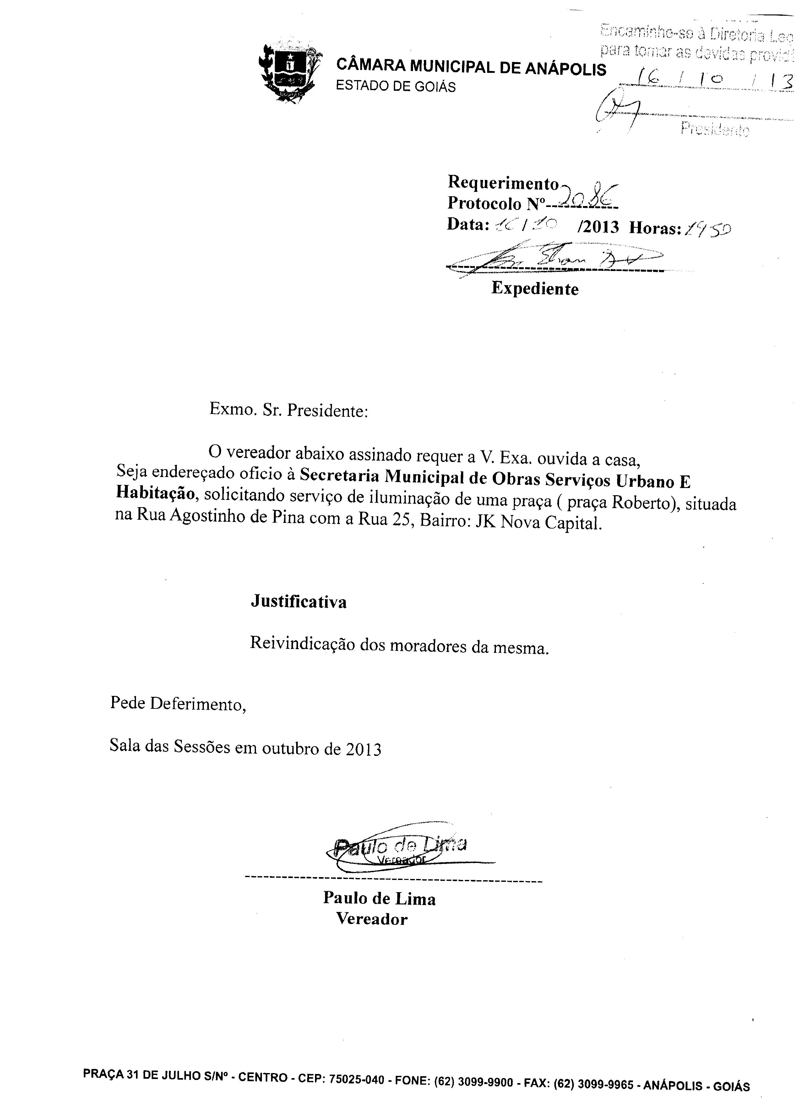 Ementa: À SECRETARIA DE OBRAS SERVIÇOS URBANOS E HABITAÇÃO, SOLICITANDO SERVIÇO DE ILUMINAÇÃO DE UMA PRAÇA(PRAÇA ROBERTO), SITUADA NA RUA AGOSTINHO DE PINA COM A RUA 25, BAIRRO: JK NOVA CAPITAL.