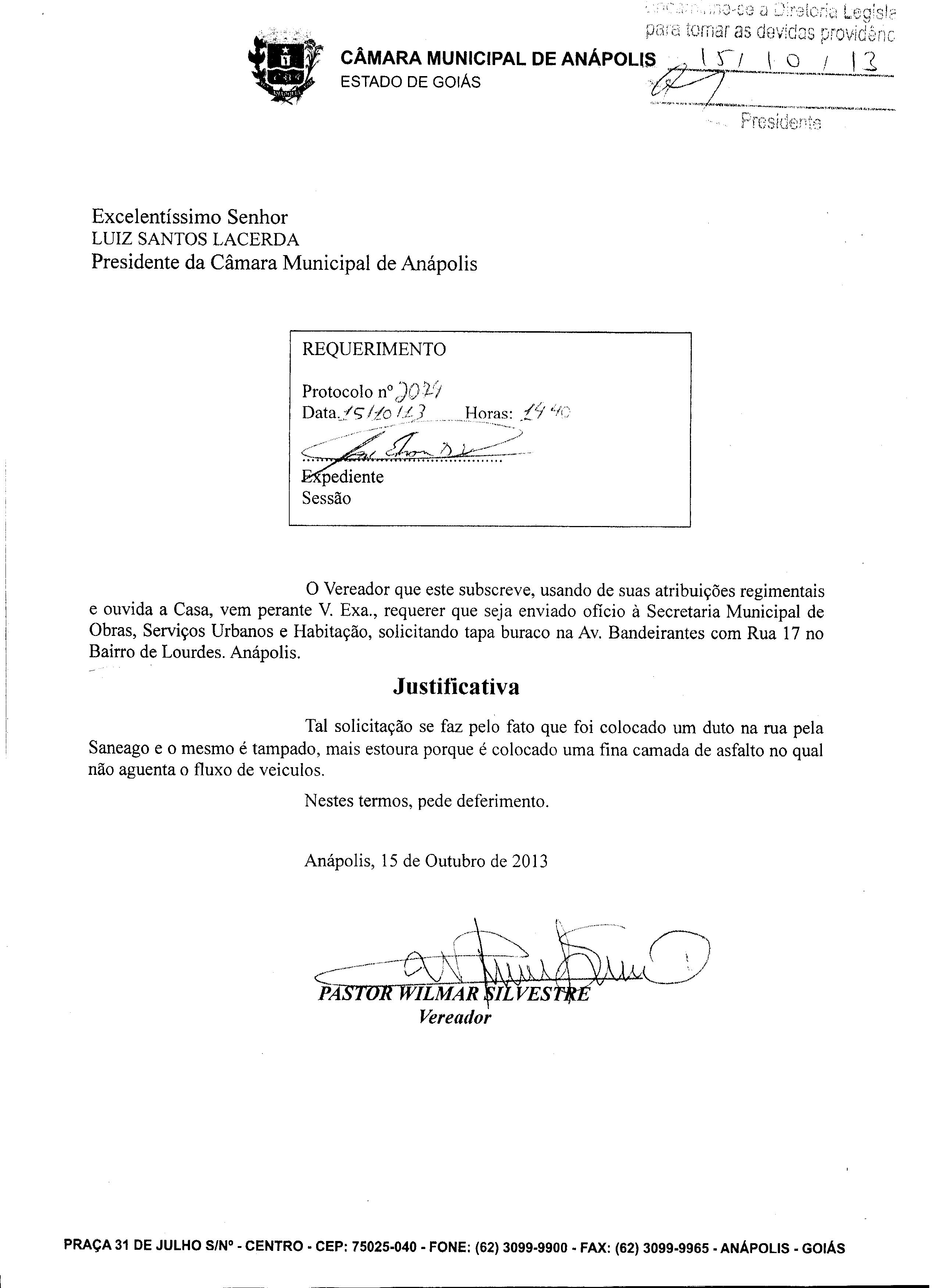 Ementa: À SECRETARIA MUNICIPAL DE OBRAS, SERVIÇOS URBANOS E HABITAÇÃO, SOLICITANDO TAPA BURACO NA AV. BANDEIRANTES COM RUA 17 NO BAIRRO DE LOURDES. ANÁPOLIS.