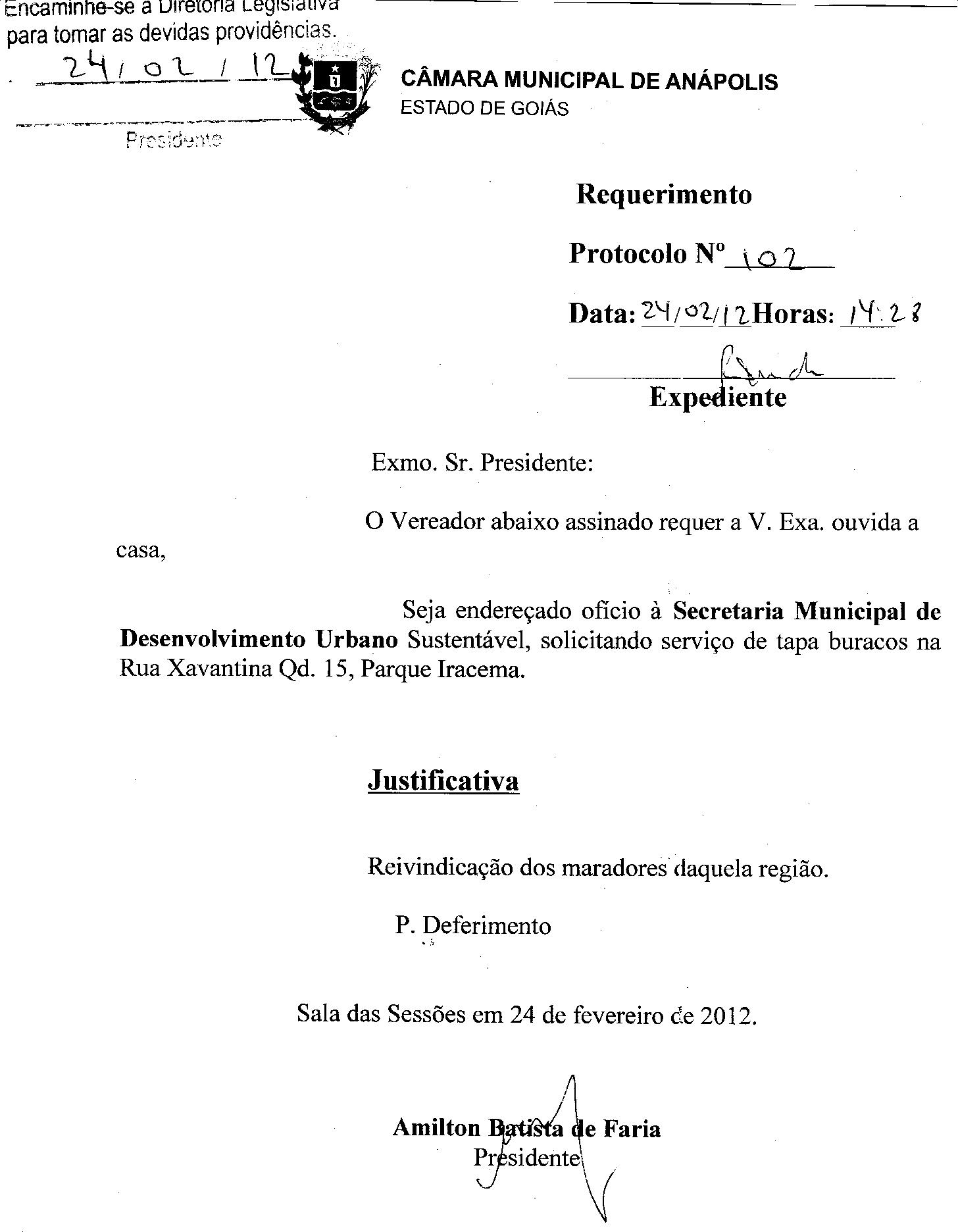 Ementa: A VEREADOR QUE A ESTE SUBSCREVE REQUER A V.EXª. OUVIDA A CASA, AS PROVIDÊNCIAS NECESSÁRIAS JUNTO A SECRETARIA MUNICIPAL DE DESENVOLVIMENTO URBANO O SERVIÇO DE TAPA BURACOS NA RUA 07, NA ALTURA DA QD.24 NO SETOR INDUSTRIAL, NOVA CAPITAL.