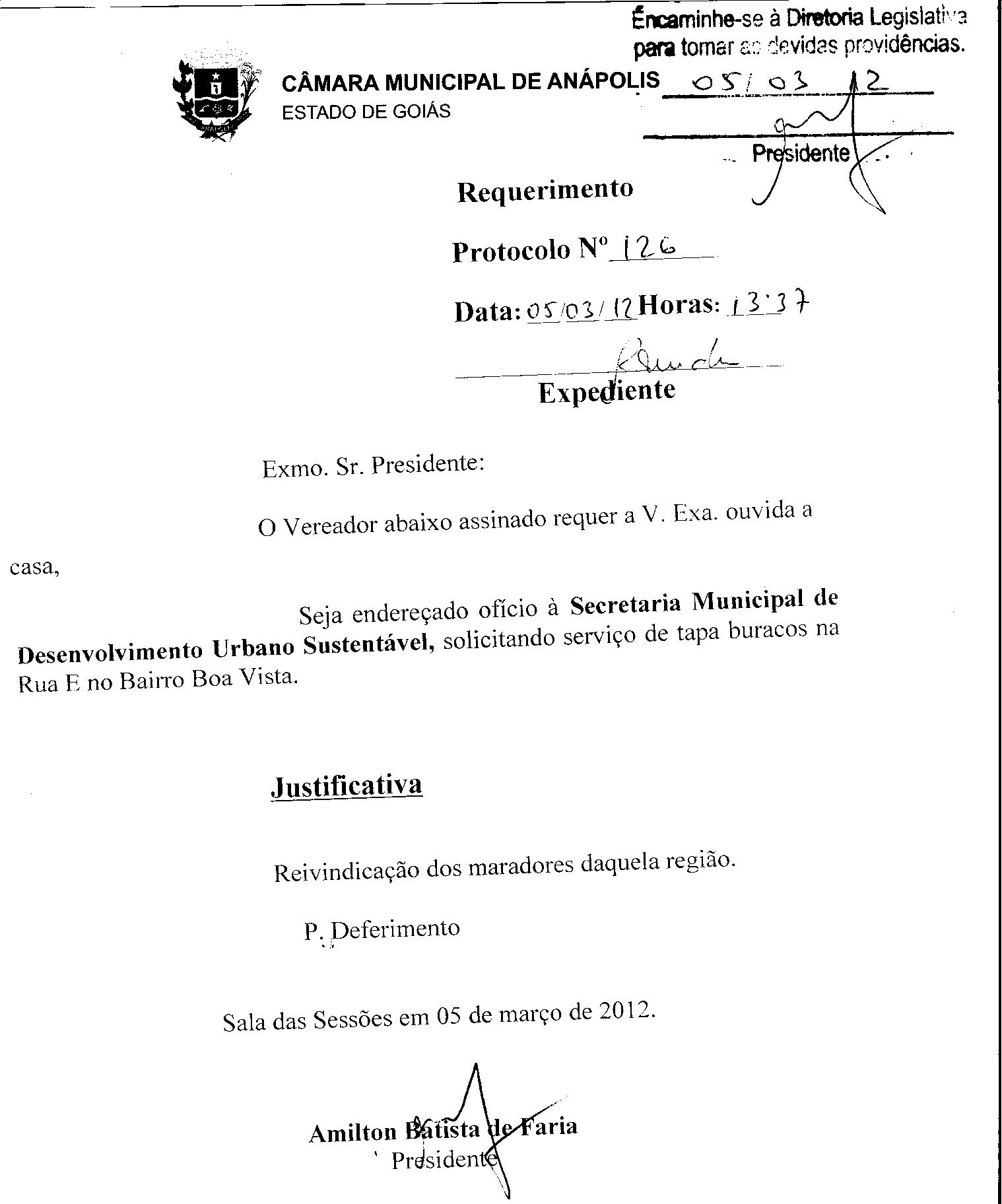 Ementa: O VEREADOR ABAIXO ASSINADO REQUER A V. EXª., OUVIDA A CASA, SEJA ENDEREÇADO OFÍCIO `A SECRETARIA MUNICIPAL DE DESENVOLVIMENTO URBANO SUSTENTÁVEL, SOLICITANDO SERVIÇO DE TAPA BURACOS NA RUA E NO BAIRRO BOA VISTA.