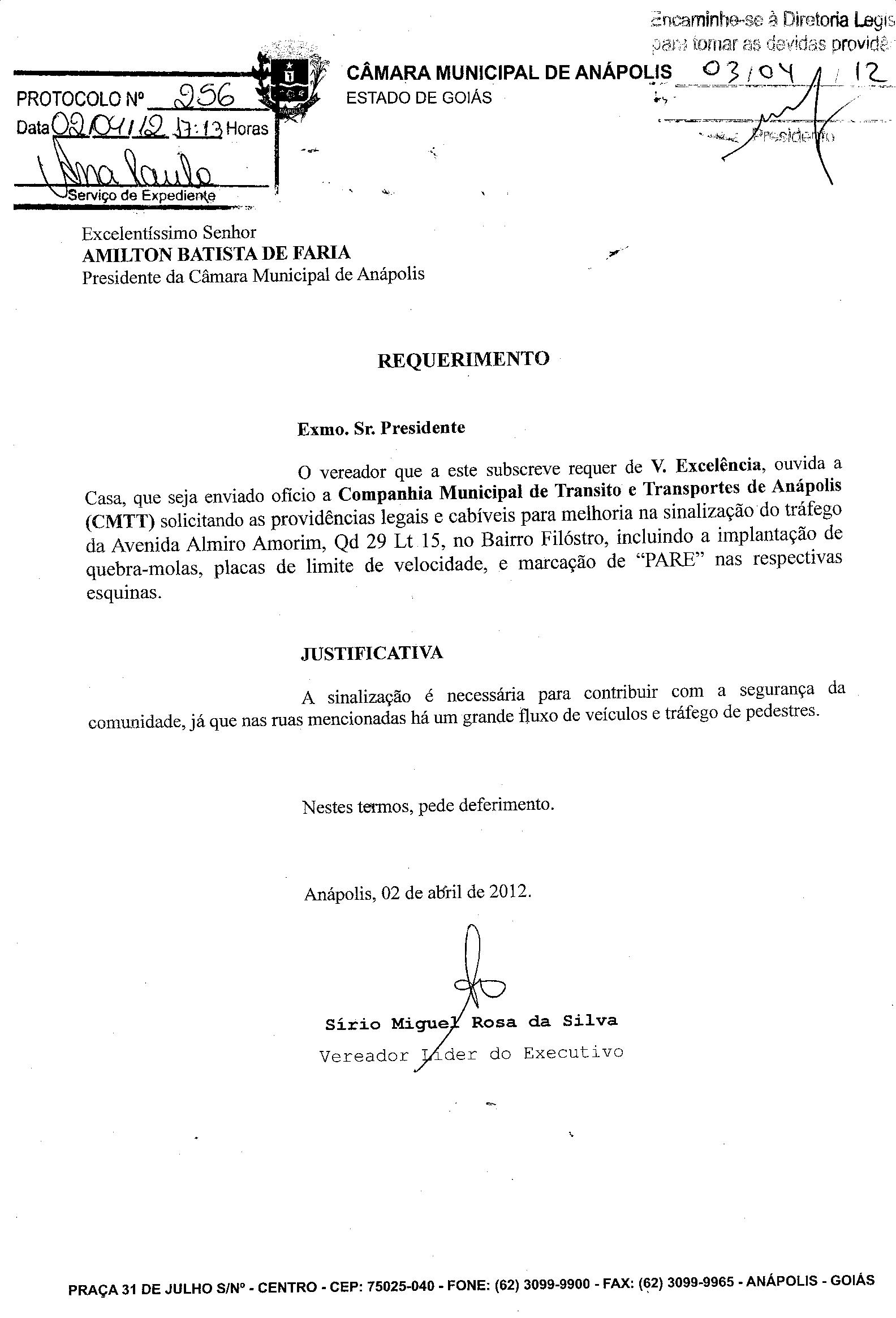 Ementa: O VEREADOR QUE A ESTE SUBSCREVE REQUER DE V.EXCELÊNCIA, OUVIDA A CASA, QUE SEJA EVIADO OFÍCIO A COMPANHIA MUNICIPAL DE TRANSITO E TRANSPORTE (CMTT) SOLICITANDO AS PROVIDÊNCIAS LEGAIS E CABIVEIS PARA MELHORIA NA SINALIZAÇÃO DO TRÁFEGO DA AVENIDA ALMIRO AMORIM, QD 29 LT 15, NO BAIRRO FILÓSTRO, INCLUINDO A IMPLANTAÇÃO DE QUEBRA-MOLAS, PLACAS DE LIMITE DE VELOCIDADE, E MARCAÇÃO DE "PARE" NAS RESPECTIVAS ESQUINAS.