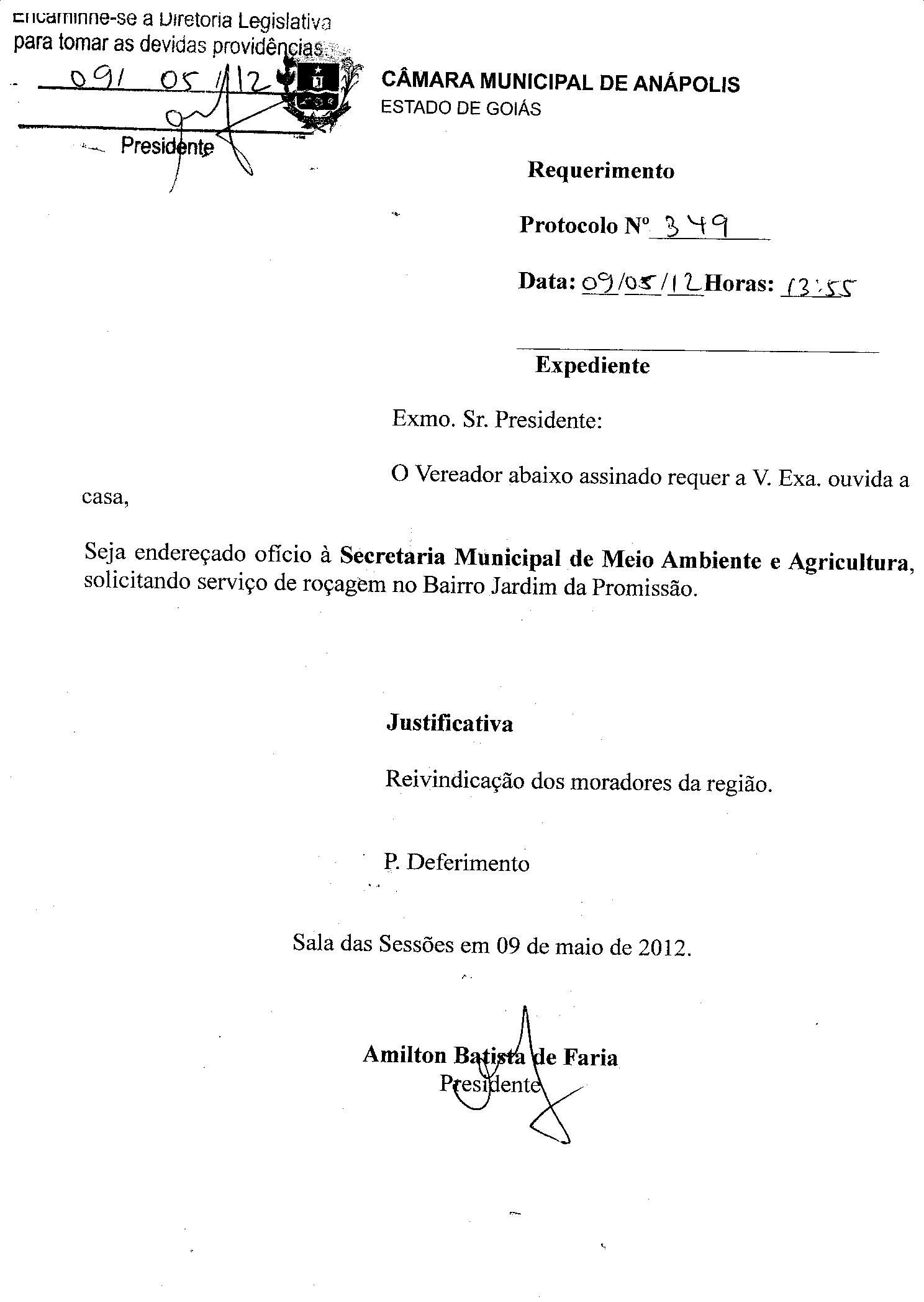Ementa: O VEREADOR ABAIXO ASSINADO REQUER A V.EXA., OUVIDA A CASA, QUE SEJA ENDEREÇADO OFÍCIO À SECRETARIA MUNICIPAL DE MEIO AMBIENTE E AGRICULTURA SOLICITANDO SERVIÇO DE ROÇAGEM NO BAIRRO JARDIM PROMISSÃO.