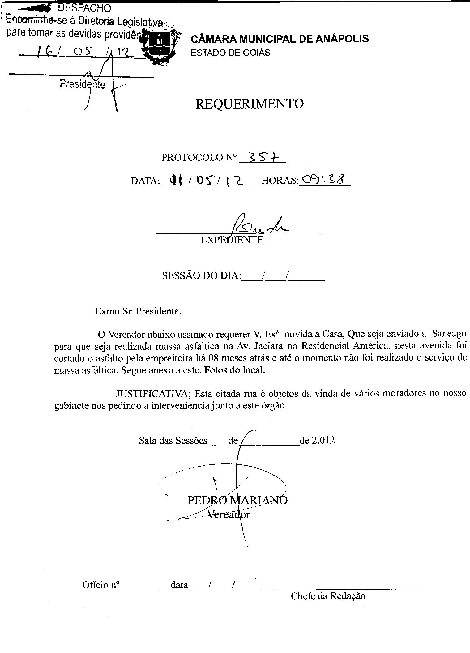 Ementa: O VEREADOR ABAIXO ASSINADO REQUERER V.EXª OUVIDA A CASA, QUE SEJA ENVIADO À SANEAGO PARA QUE SEJA REALIZADA MASSA ASFÁLTICA NA AV. JACIRA NO RESIDENCIAL AMÉRICA, NESTA AVENIDA FOI CORTADO O ASFALTO PELA EMPREITEIRA HÁ 08 MESES ATRÁS E ATÉ O MOMENTO NÃO FOI REALIZADO O SERVIÇO DE MASSA ASFÁLTICA.SEGUE ANEXO A ESTE. FOTOS DO LOCAL.