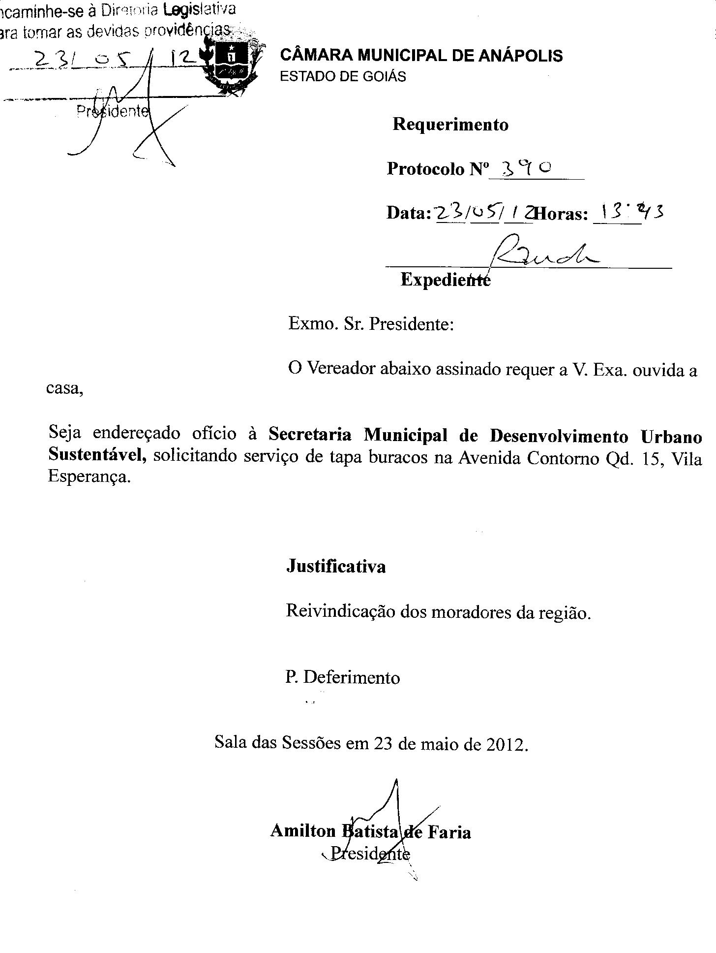Ementa: O VEREADOR ABAIXO ASSINADO REQUER A V.EXA. OUVIDA A CASA, SEJA ENDEREÇADO OFÍCIO À SECRETARIA MUNICIPAL DE DESENVOLVIMENTO URBANO SUSTENTÁVEL, SOLICITANDO SERVIÇO DE TAPA BURACOS NA AVENIDA CONTORNO QD. 15, VILA ESPERANÇA.