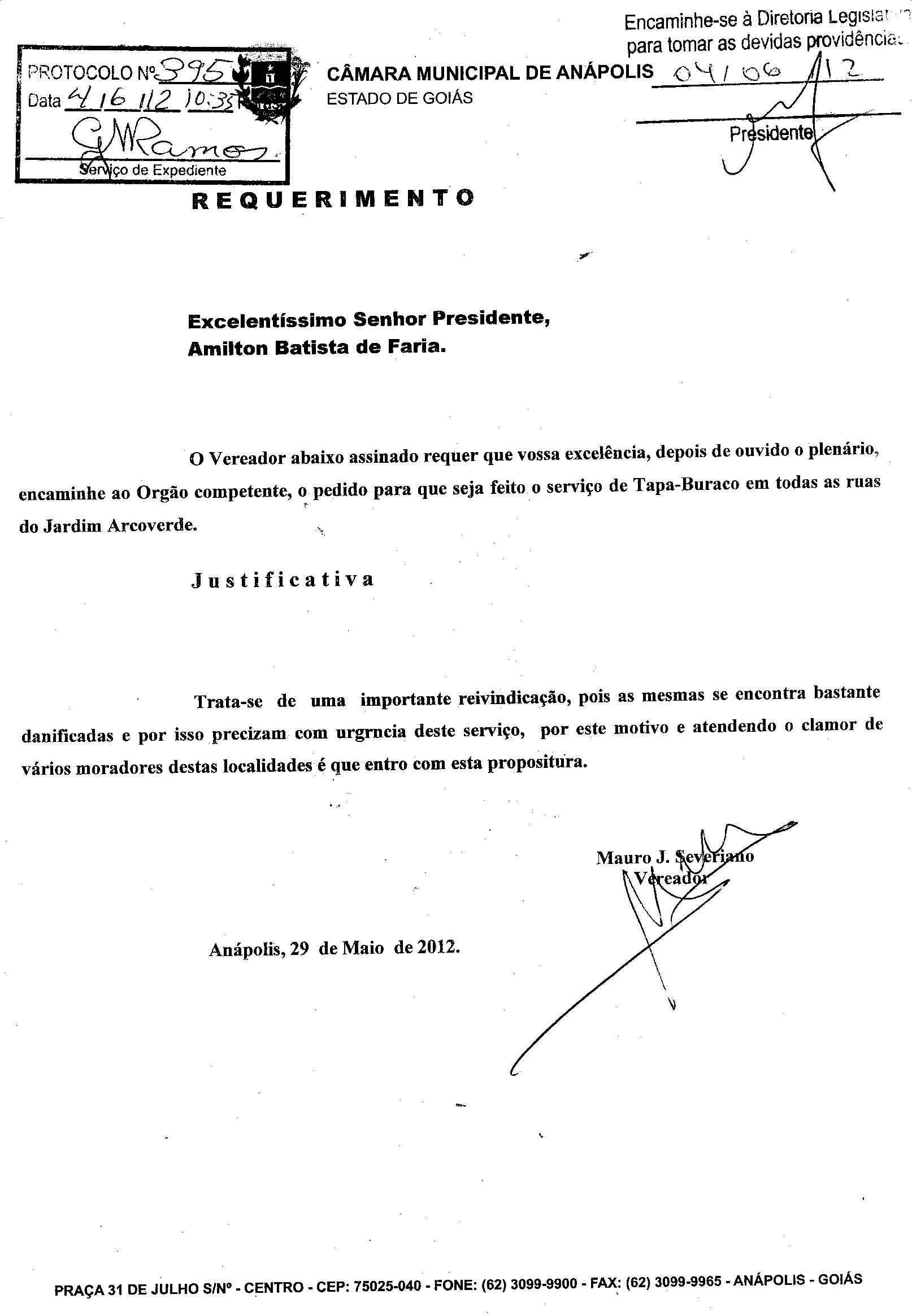 Ementa: O VEREADOR ABAIXO ASSINADO REQUER QUE VOSSA EXCELÊNCIA, DEPOIS DE OUVIDO O PLENÁERIO, ENCAMINHE AO ORGÃO COMPETENTE, O PEDIDO PARA QUE SEJA FEITO O SERVIÇO DE TAPA-BURACO EM TODAS AS RUAS DO JARDIM ARCOVERDE.