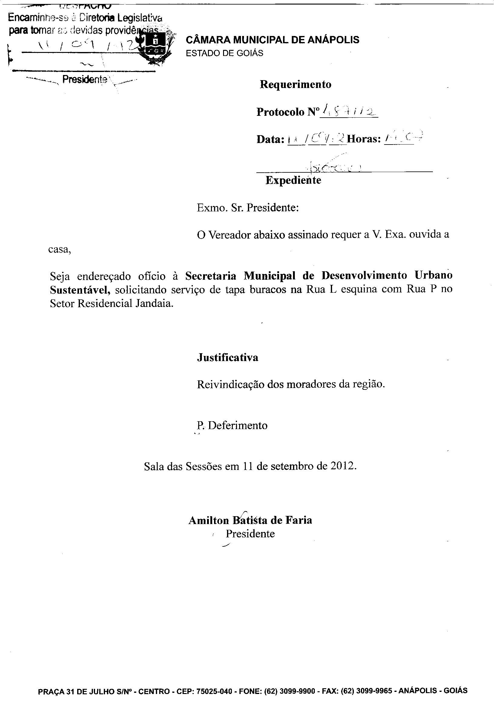 Ementa: O VEREADOR ABAIXO ASSINADO REQUER A V. EXª. OUVIDA A CASA SEJA ENDEREÇADO OFÍCIO À SECRETARIA MUNICIPAL DE DESENVOLVIMENTO URBANO SUSTENTÁVEL,SOLICITANDO SERVIÇO DE TAPA BURACOS NA RUA ANÁPOLIS, QD. 38 E ESQUINA COM AVENIDA PEDRO LUDOVICO, PARQUE CALIXTÓPOLIS.