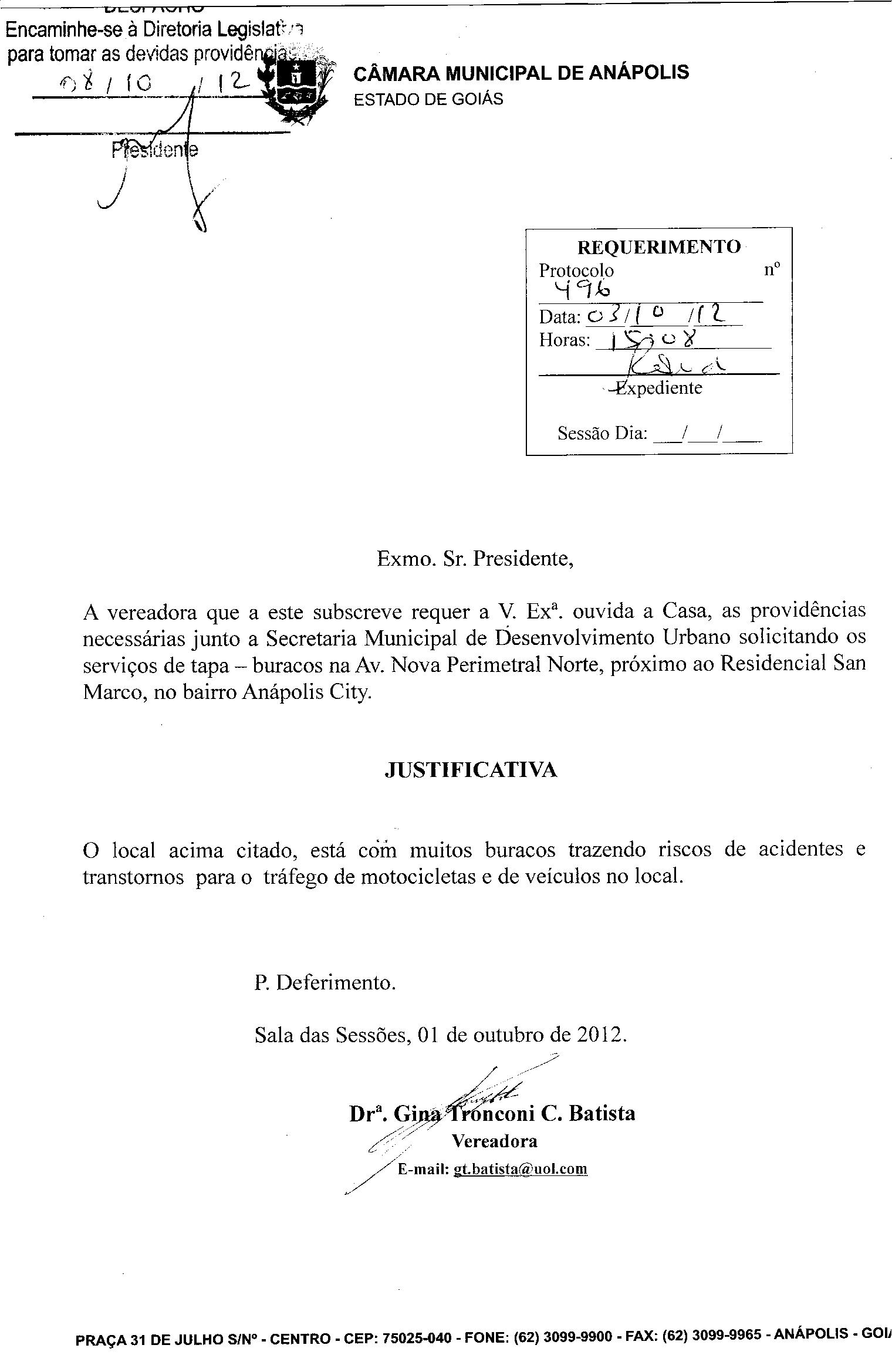 Ementa: A VEREADORA QUE A ESTE SUBSCREVE REQQUER A V.EXª. OUVIDA A CASA, AS PROVIDÊNCIAS NECESSÁRIAS JUNTO A SECRETARIA MUNICIPAL DE DESENVOLVIMENTO URBANO, SOLICITANDO OS SERVIÇOS DE TAPA-BURACOS NA AV. NOVA PERIMENTAL NORTE, PRÓXIMO AO RESIDENCIAL SAM MARCO, NO B. ANAPOLIS CITY.
