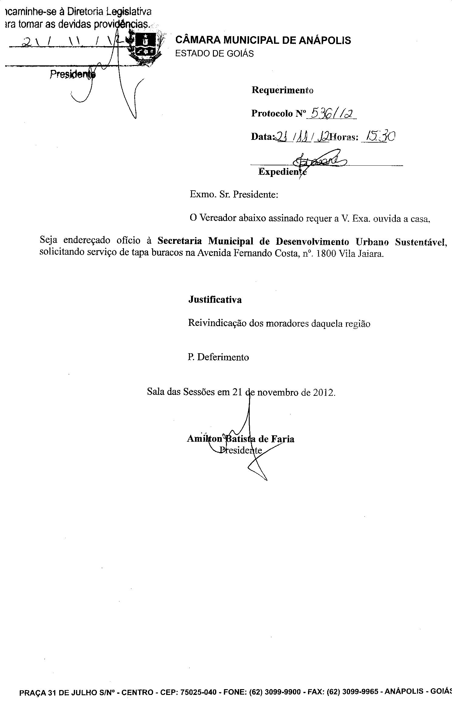 Ementa: O VEREADOR ABAIXO ASSINADO REQUER A V. EXA.OUVIDA A CASA, SEJA ENDEREÇADO OFÍCIO À SECRETARIA MUNCIPAL DE DESENVOLVIMENTO URBANO SUSTENTÁVEL, SOLICITANDO SERVIÇO DE TAPA BURACOS NA AVENIDA FERNANDO COSTA, Nº. 1800 VILA JAIARA.