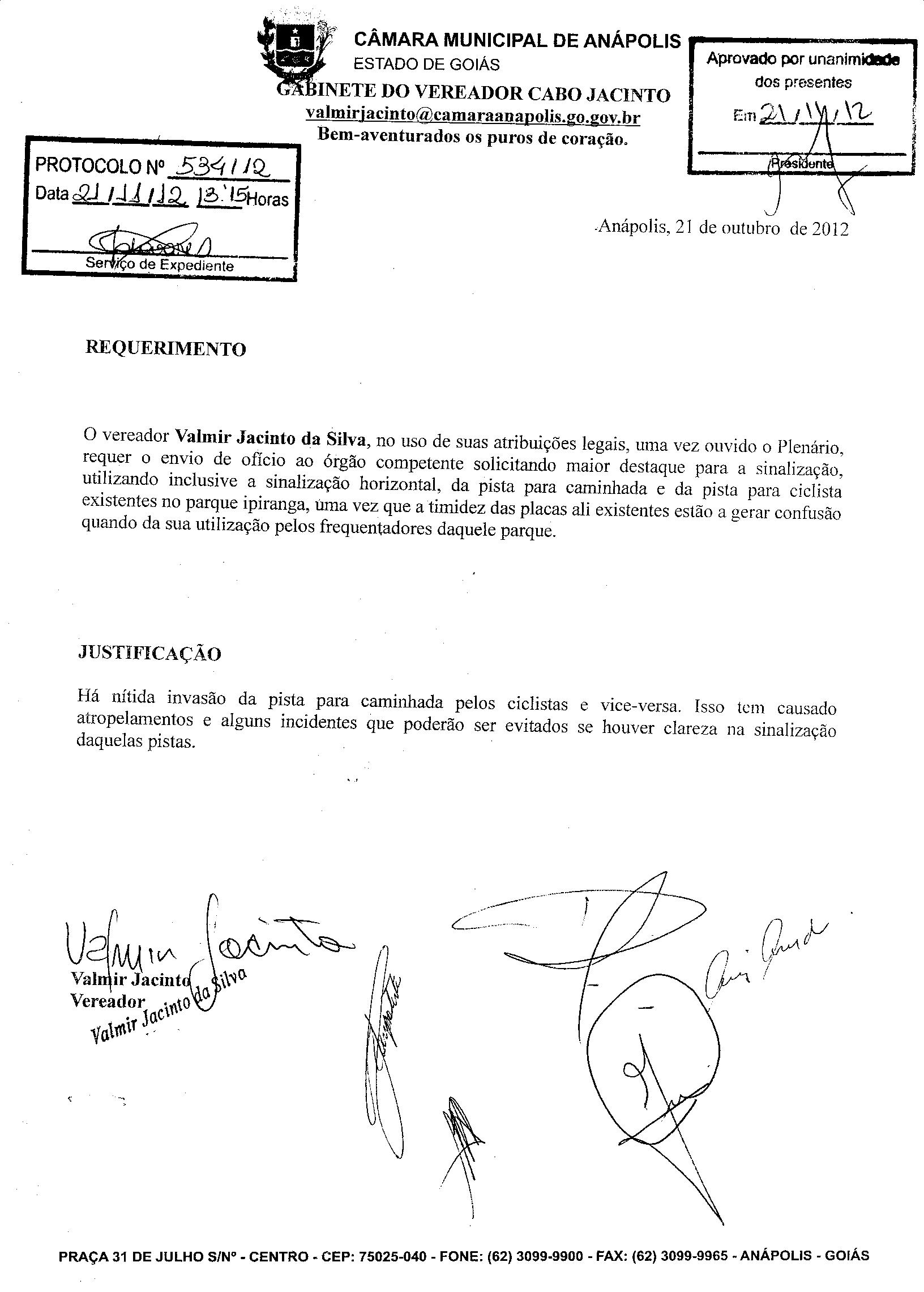 Ementa: O VEREADOR VALMIR JACINTO DA SILVA, NO USO DE SUAS ATRIBUIÇÕES LEGAIS,UMA VEZ OUVIDO O PLENÁRIO, REQUER O ENVIO DE OFÍCIO AO ÓRGÃO COMPETENTE SOLICITANDO MAIOR DESTAQUE PARA A SINALIZAÇÃO, UTILIZANDO INCLUSIVE A SINALIZAÇÃO HORIZONTAL, DA PISTA PARA CAMINHADA E DA PISTA PARA CICLISTA EXISTENTES NO PARQUE IPIRANGA, UMA VEZ QUE A TIMIDEZ DAS PLACAS ALI EXISTENTES ESTÃO A GERAR CONFUSÃO QUANDO DA SUA UTILIZAÇÃO PELOS FREQUENTADORES DAQUELE PARQUE.