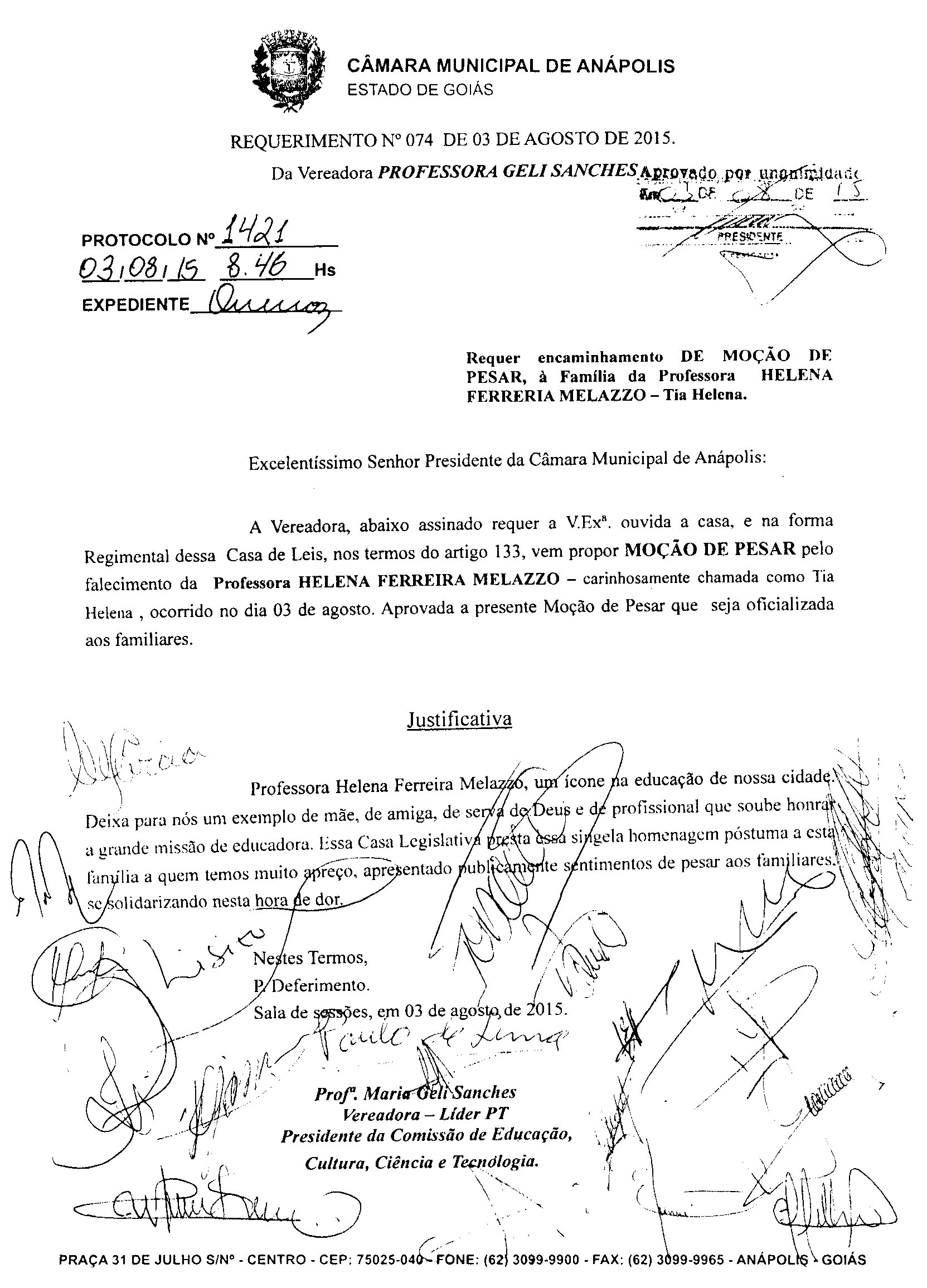 ![]() MOÇÃO DE PESAR PELO FALECIMENTO DA PROFESSORA HELENA FERREIRA MELAZZO - CARINHOSAMENTE CHAMADA COMO TIA HELENA, OCORRIDO NO DIA 03 DE AGOSTO. APROVADA A PRESENTE MOÇÃO DE PESAR QUE SEJA OFICIALIZADA AOS FAMILIARES.