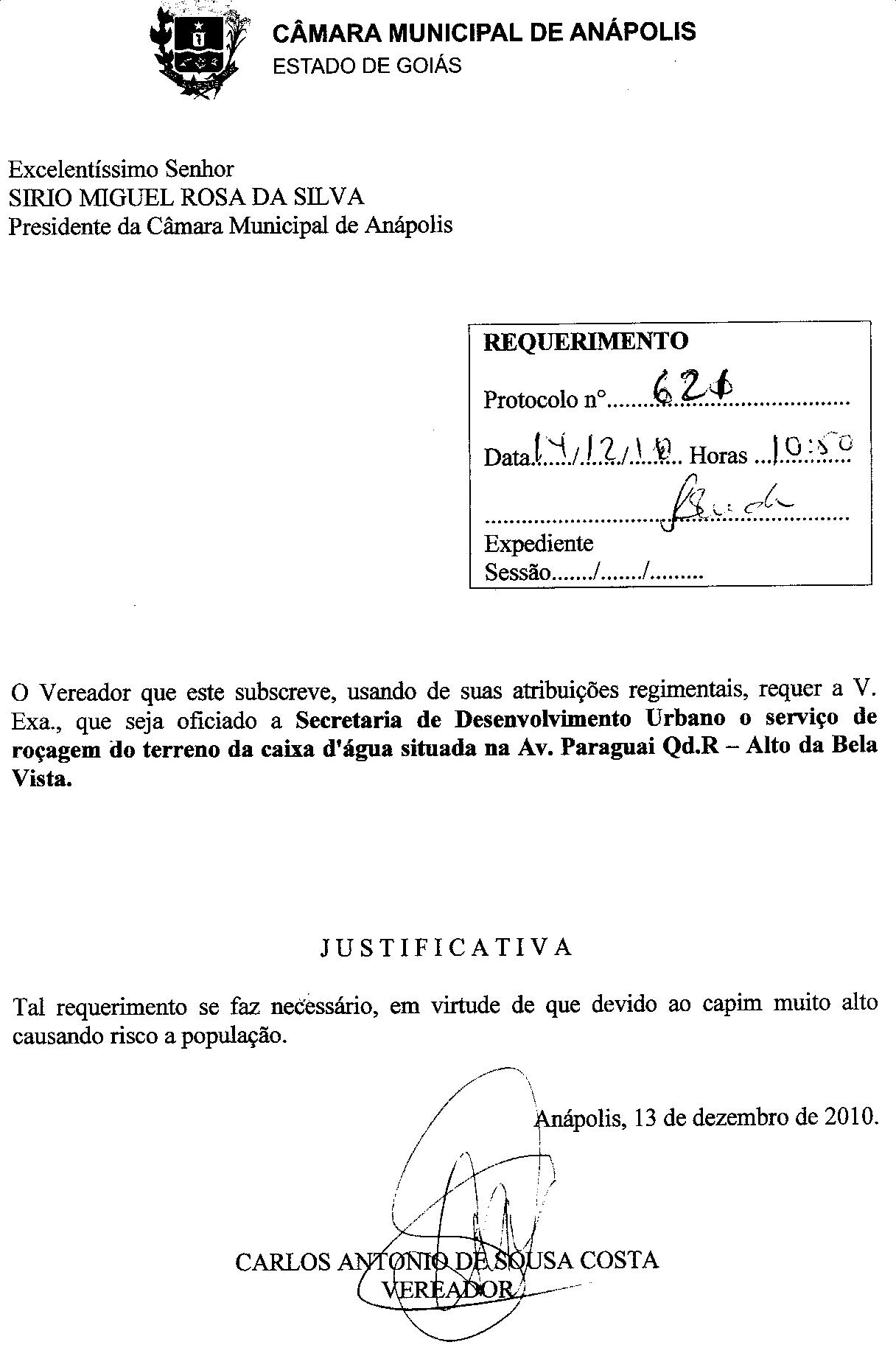 ![]() O VEREADOR QUE ESTE SUBSCREVE, USANDO DE ATRIBUIÇÕES REGIMENTAIS, REQUER A V. EXA., QUE SEJA OFICIADO A SECRETARIA DE DESENVOLVIMENTO URBANO O SERVIÇO DE ROÇAGEM DO TERRENO DA CAIXA D'ÁGUA SITUADA NA AV. PARAGIAI QD.R -ALTO DA BELA VISTA.