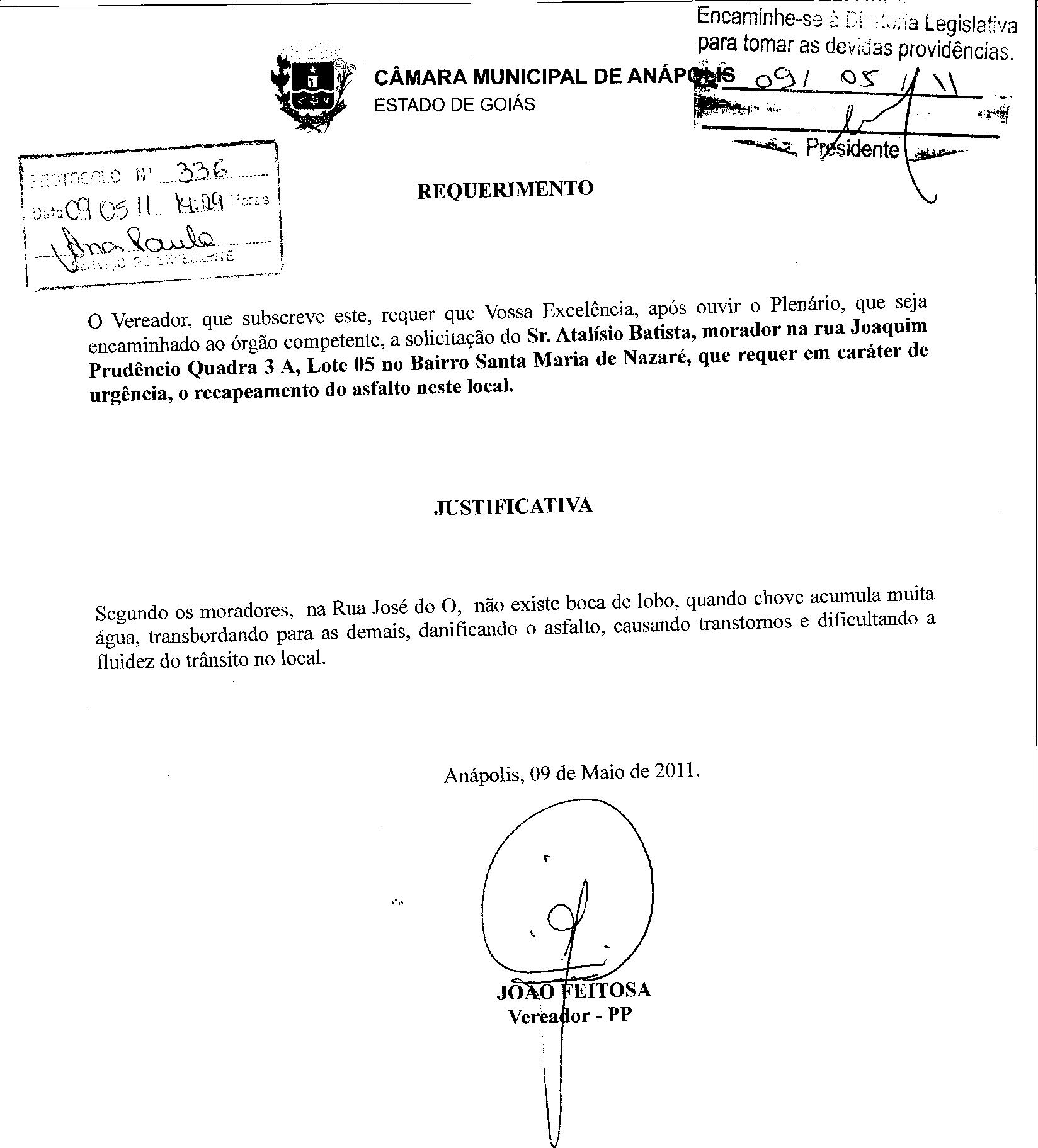 Ementa: O VEREADOR, QUE SUBSCREVE ESTE, REQUER QUE VOSSA EXCELÊNCIA, APÓS OUVIR O PLENÁRIO, QUE SEJA ENCAMINHADO AO ÓRGÃO COMPETENTE, A SOLICITAÇÃO DO SR. ATLÍSIO BATISTA, MORADOR NA RUA JOAQUIM PRUDÊNCIO QUADRA 3 A, LOTE 05 NO BAIRRO SANTA MARIA DE NAZARÉ, QUE REQUER EM CARÁTER DE URGÊNCIA, O RECAPEAMENTO DO ASFALTO NESTE LOCAL.