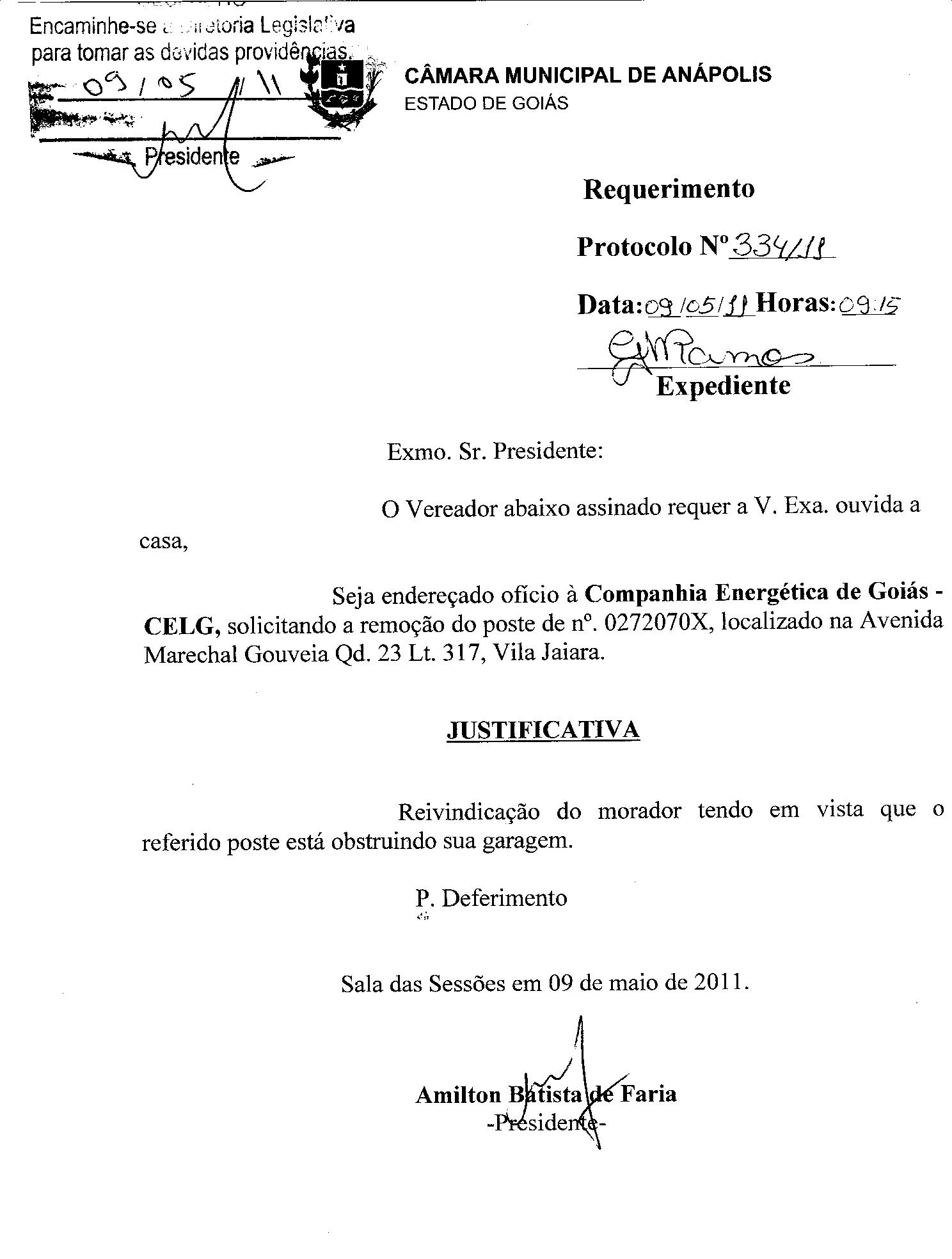 Ementa: O VEREADOR ABAIXO ASSINADO REQUER A V.EXA. OUVIDA A CASA, SEJA ENDEREÇADO OFÍCIO À COMPANHIA ENERGÉTICA DE GOIÁS - CELG, SOLICITANDO A REMOÇÃO DO POSTE DE Nº 0272070X, LOCALIZADO NA AVENIDA MARECHAL GOUVEIA QD. 23 LT.317, VILA JAIARA.