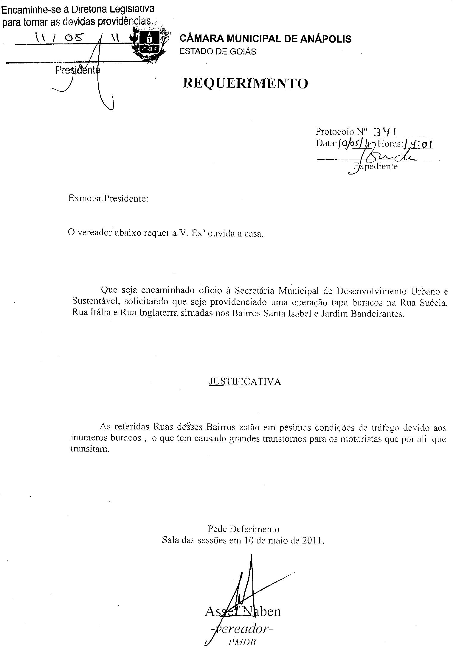 Ementa: O VEREADOR ABAIXO REQUER A V.EXª OUVIDA A CASA, QUE SEJA ENCAMINHADO OFÍCIO À SECRETÁRIA MUNICIPAL DE DESENVOLVIMENTO URBANO E SUSTENTÁVEL, SOLICITANDO QUE SEJA PROVIDENCIADO UMA OPERAÇÃO TAPA BURACO NA RUA SUÉCIA, RUA ITÁLIA E RUA INGLATERRA SITUADAS NOS BAIRROS SANTA ISABEL E JARDIM BANDEIRANTES.