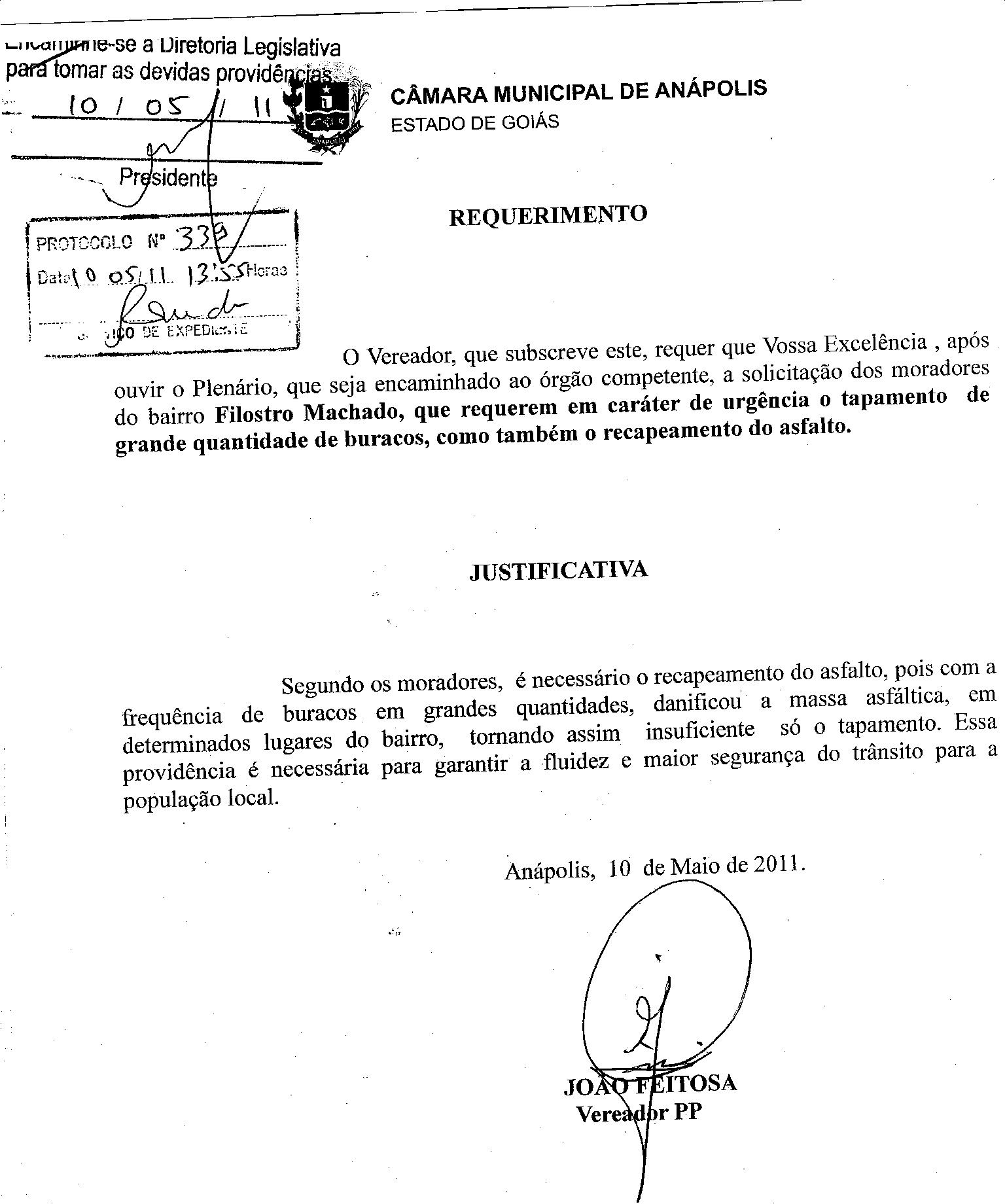 Ementa: O VEREADOR, QUE SUBSCREVE ESTE, REQUER QUE VOSSA EXCELÊNCIA, APÓS OUVIR O PLENÁRIO, QUE SEJA ENCAMINHADO AO ÓRGÃO COMPETENTE, A SOLICITAÇÃO DOS MORADORES DO BAIRRO FILOSTRO MACHADO, QUE REQUEREM EM CARÁTER DE URGÊNCIA O TAPAMENTO DE GRANDE QUANTIDADE DE BURACOS, COMO TAMBÉM O RECAPEAMENTO DO ASFALTO.