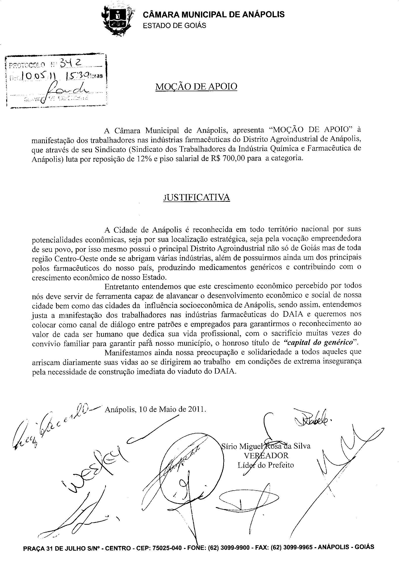 Ementa: A CÂMARA MUNICIPAL DE ANÁPOLIS, APRESENTA "MOÇÃO DE APOIO" À MANIFESTAÇÃO DOS TRABALHADORES NA INDÚSTRIAS FARMACÊUTICAS DO DISTRITO AGROINDUSTRIAL DE ANÁPOLIS, QUE ATRAVÉS DE SEU SINDICATO (SINDICATO DOS TRABALHADORES DA INDÚSTRIA QUÍMICA E FARMACÊUTICA DE ANÁPOLIS) LUTA POR REPOSIÇÃO DE 12% E PISO SALARIAL DE R$ 700,00 PARA A CATEGORIA.