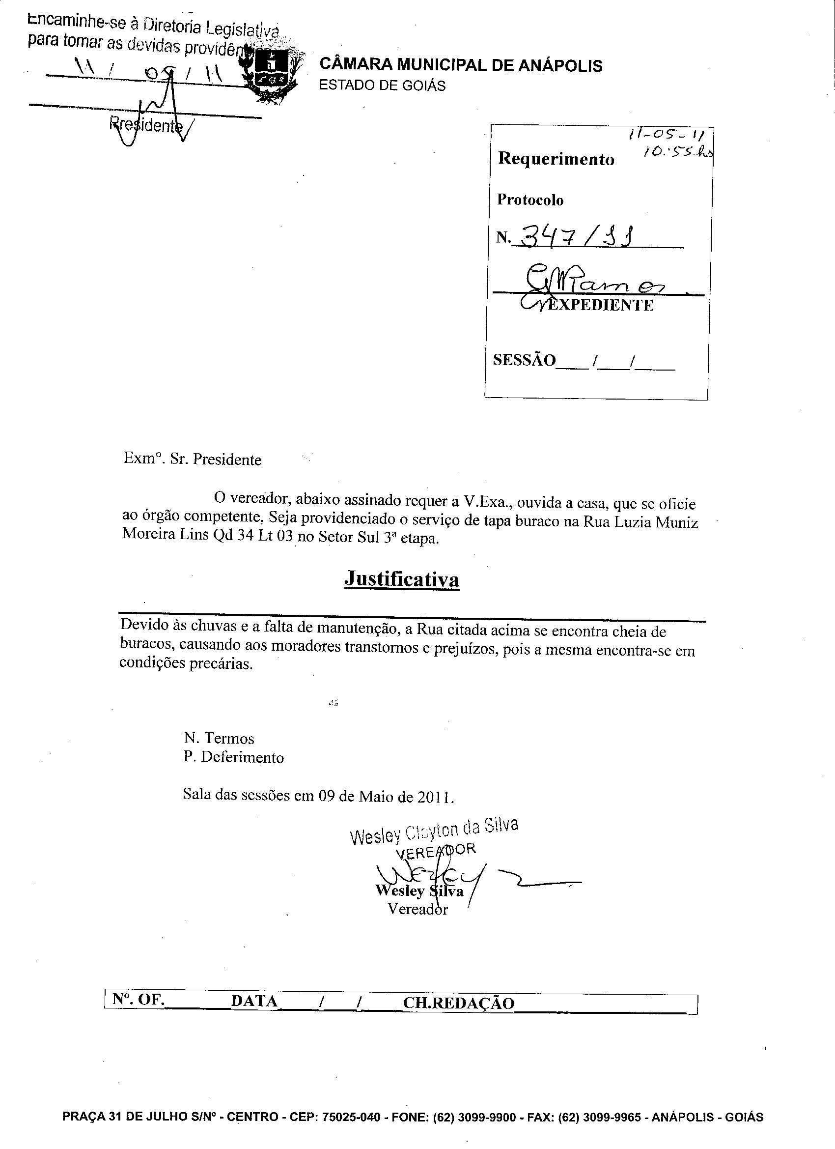 Ementa: O VEREADOR, ABAIXO ASSINADO REQUER A V.EXA., OUVIDA A CASA , QUE SE OFÍCIE AO ÓRGÃO COMPETENTE, SEJA PROVIDENCIADO O SERVIÇO DE TAPA BURACO NA RUA LUZIA MUNIZ MOREIRA LINS Q.D 34 LT.O3 NO SETOR SUL 3ª ETAPA.