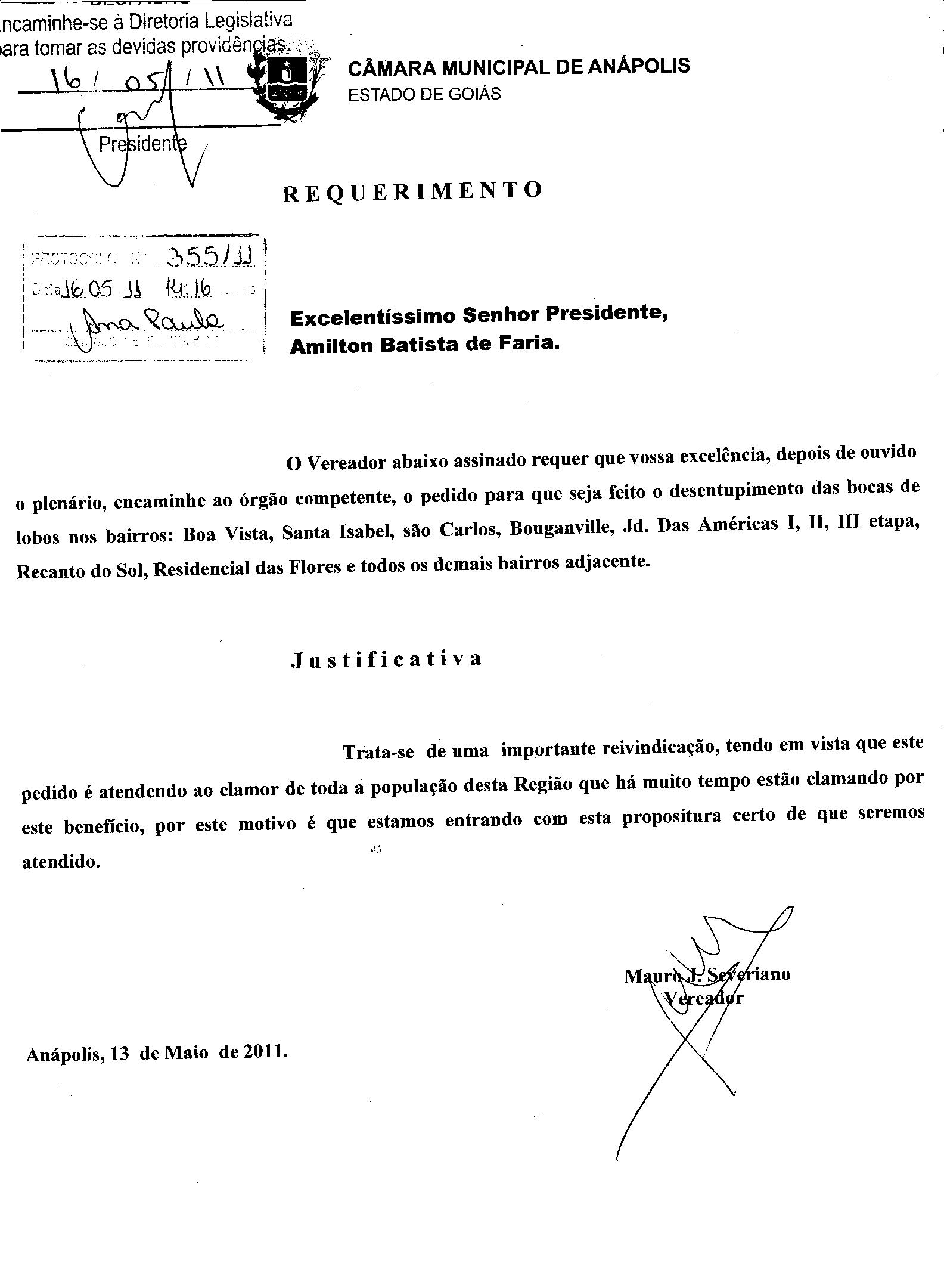 Ementa: O VEREADOR ABAIXO ASSINADO REQUER VOSSA EXCELÊNCIA, DEPOIS DE OUVIDO O PLENÁRIO, ENCAMINHE AO ÓRGÃO COMPETENTE, O PEDIDO PARA QUE SEJA FEITO O DESENTUPIMENTO DAS BOCAS DE LOBOS NOS BAIRROS: BOA VISTA, SANTA ISABEL, SÃO CARLOS, BOUGANVILLE, JD. DAS AMÉRICAS I, II, II ETAPA, RECANTO DO SOL, RESIDENCIAL DAS FLORES E TODOS OS DEMAIS BAIRROS ADJACENTE.