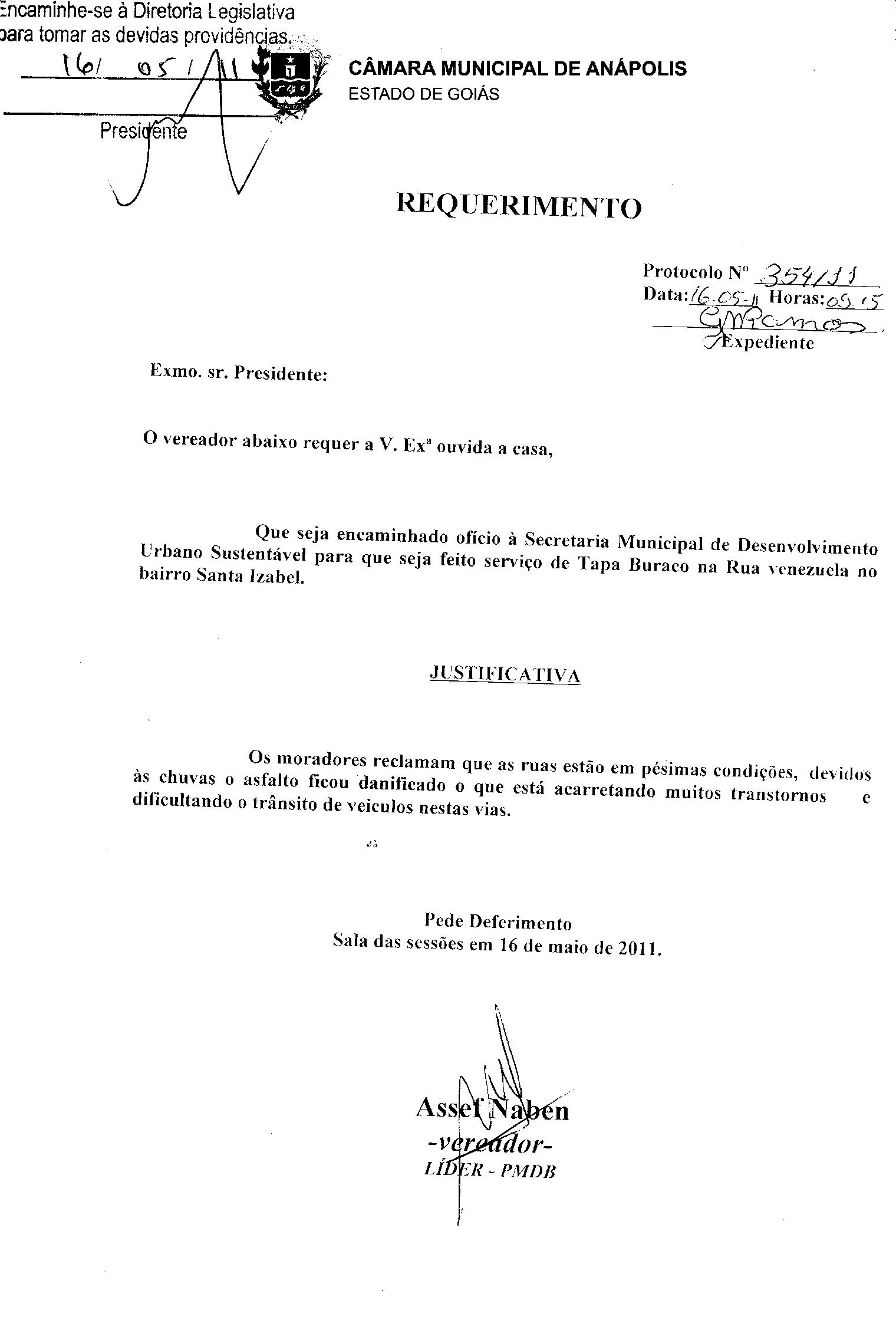 Ementa: O VEREADOR ABAIXO REQUER A V.EXª OUVIDA A CASA, QUE SEJA ENCAMINHADO OFÍCIO À SECRETARIA MUNICIPAL DE DESENVOLVIMENTO URBANO SUSTENTÁVEL PARA QUE SEJA FEITO SERVIÇO DE TAPA BURACO NA RUA VENEZUELA NO BAIRRO SANTA IZABEL.