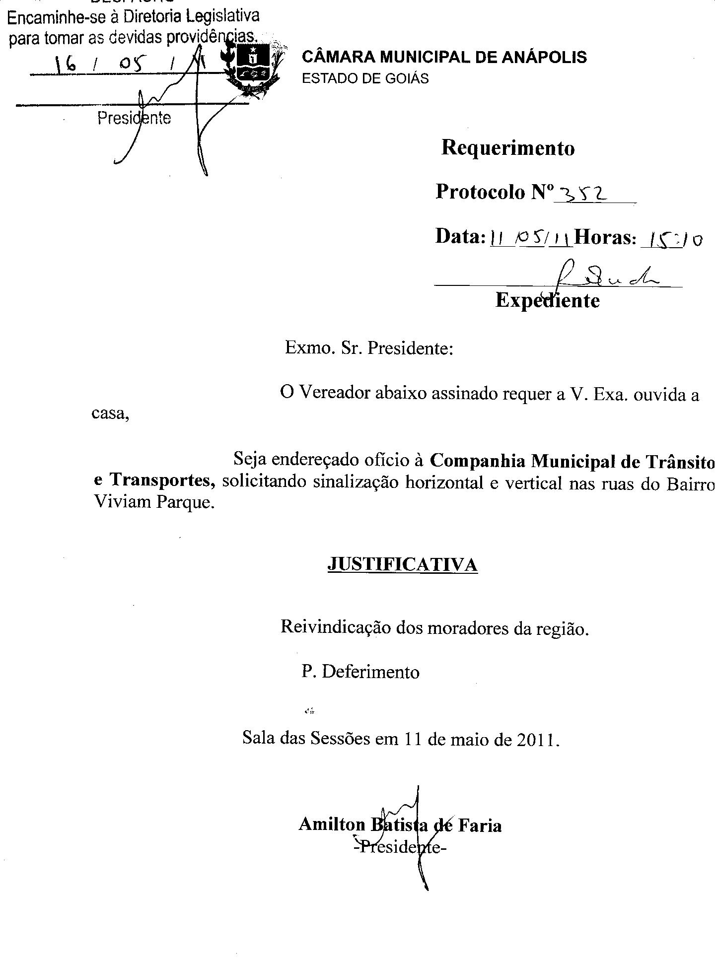 Ementa: O VEREADOR ABAIXO ASSINADO REQUER A V.EXA. OUVIDA A CASA, SEJA ENDEREÇADO OFÍCIO À COMPANHIA MUNICIPAL DE TRÂNSITO E TRANSPORTES, SOLICITANDO SINALIZAÇÃO HORIZONTAL E VERTICAL NAS RUAS DO BAIRRO VIVIAN PARQUE.