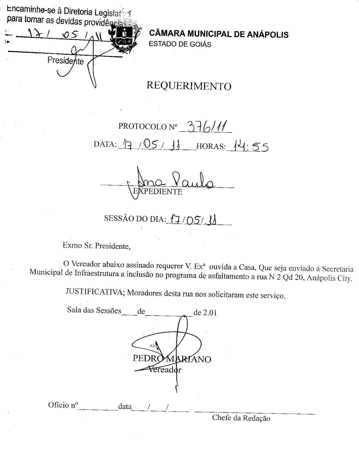 Ementa: O VEREADOR ABAIXO ASSINANDO REQUERER V.EXª OUVIDA A CASA, QUE SEJA ENVIADO À SECRETARIA MUNICIPAL DE INFRAESTRUTURA A INCLUSÃO NO PROGRAMA DE ASFALTAMENTO A RUA N 2 QD 20, ANÁPOLIS CITY.