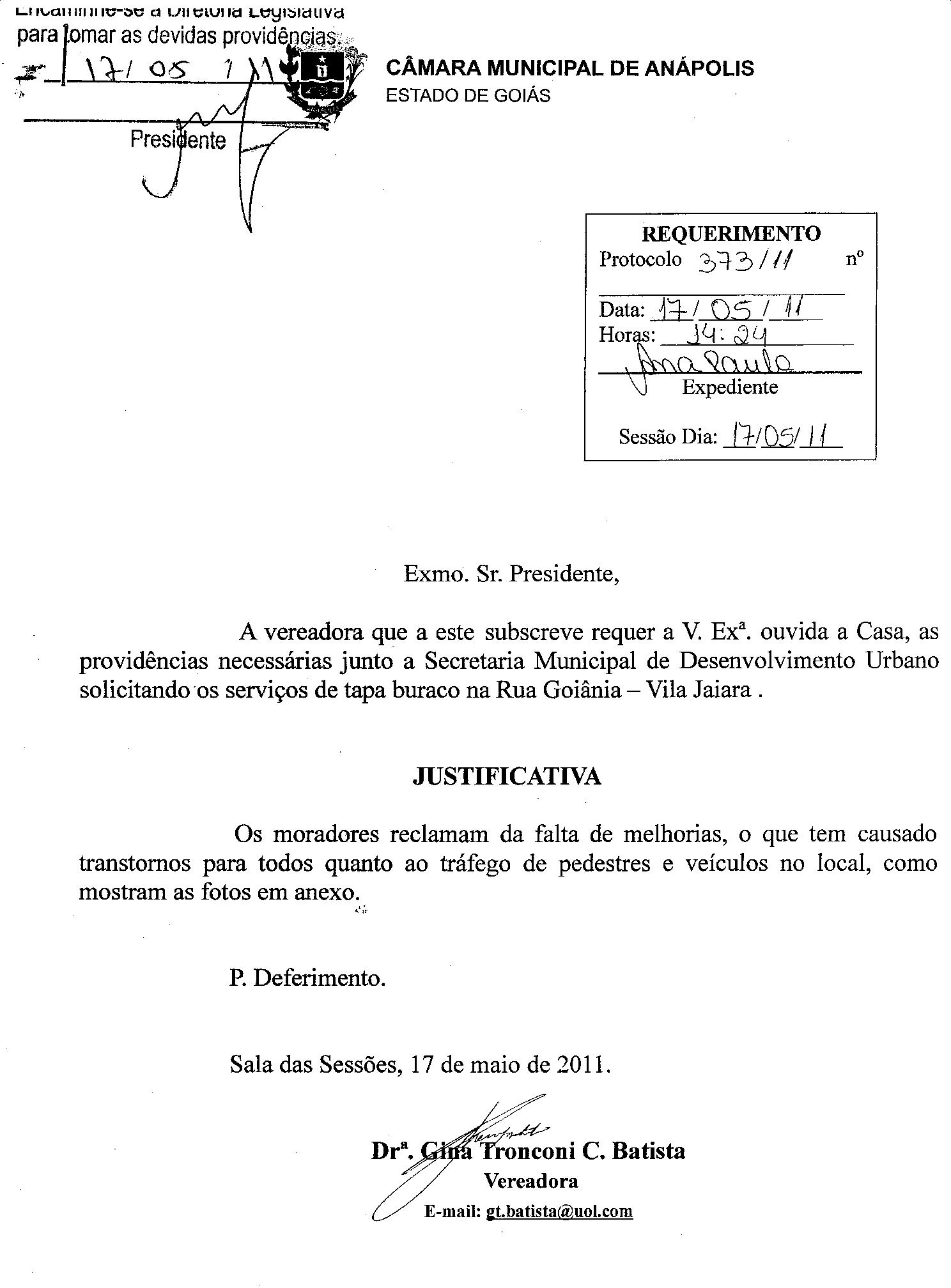 Ementa: A VEREADORA QUE A ESTE SUBSCREVE REQUER A V.EXª. OUVIDA A CASA, AS PROVIDÊNCIAS NECESSÁRIAS JUNTO A SECRETÁRIA MUNICIPAL DE DESENVOLVIMENTO URBANO SOLICITANDO OS SERVIÇOS DE TAPA BURACO NA RUA GOIÂNIA- VILA JAIARA.
