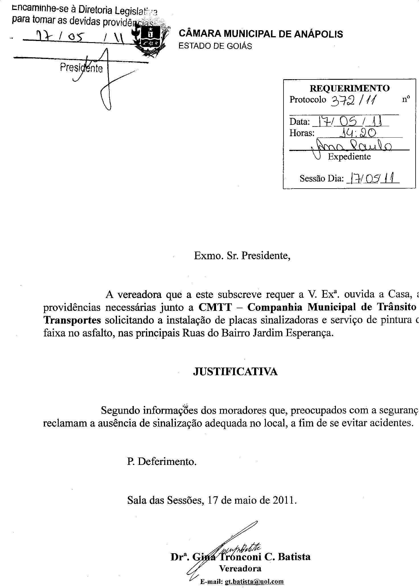 Ementa: A VEREADORA QUE A ESTE SUBSCREVE REQUER A V.EXª. OUVIDA A CASA, AS PROVIDÊNCIAS NECESSÁRIAS JUNTO A CMTT- COMPANHIA MUNICIPAL DE TRÂNSITO E TRANSPORTES SOLICITANDO A INSTALAÇÃO DE PLACAS SINALIZADORAS E SERVIÇO DE PINTURA DE FAIXA NO ASFALTO, NAS PRINCIPAIS RUAS DO BAIRRO JARDIM ESPERANÇA.