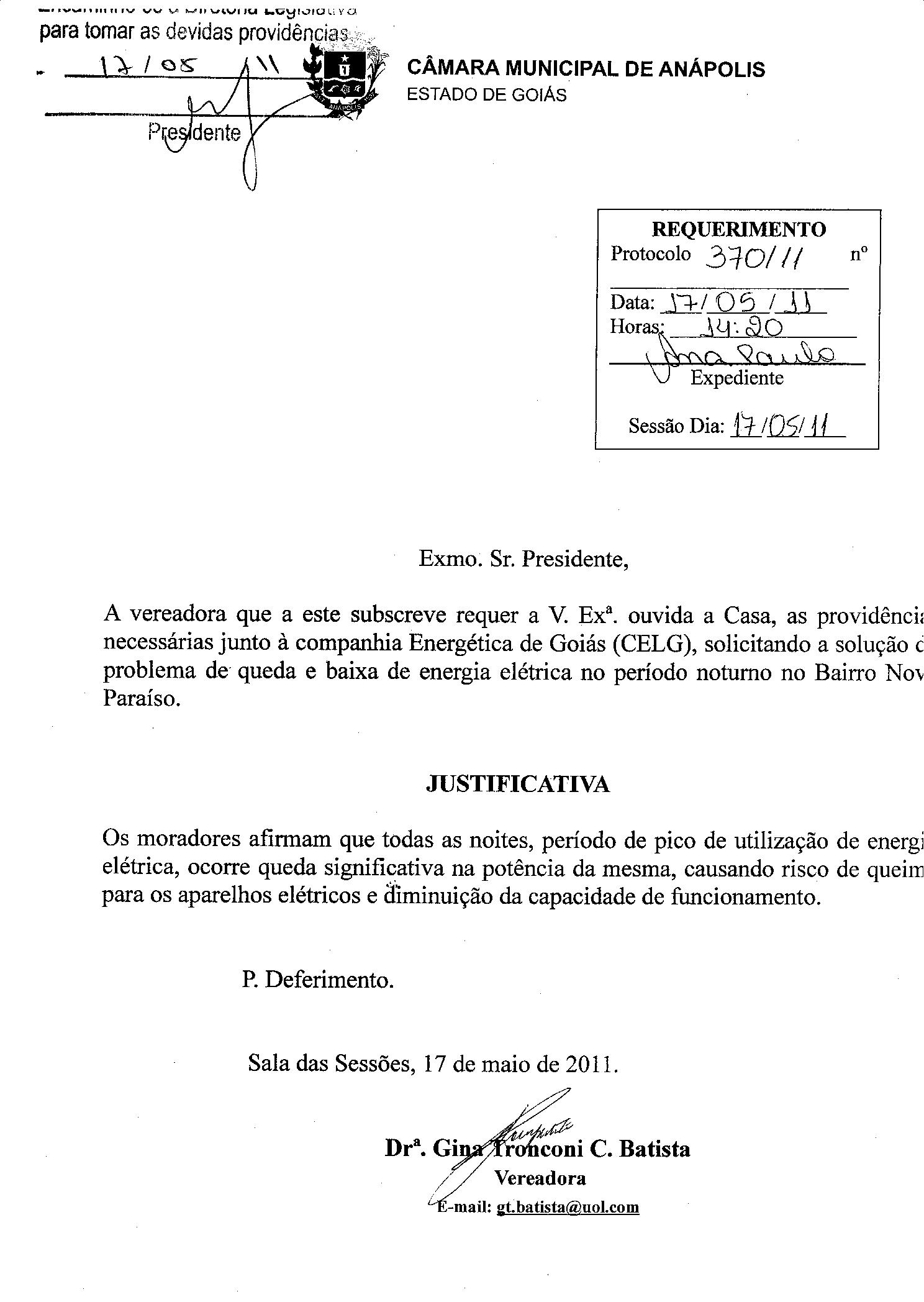 Ementa: A VEREADORA QUE A ESTE SUBSCREVE REQUER A V.EXª. OUVIDA A CASA, AS PROVIDÊNCIAS NECESSÁRIAS JUNTO À COMPANHIA ENERGÉTICA DE GOIÁS(CELG), SOLICITANDO A SOLUÇÃO DO PROBLEMA DE QUEDA E BAIXA DE ENERGIA ELÉTRICA NO PERÍODO NOTURNO BAIRRO NOVO PARAÍSO.