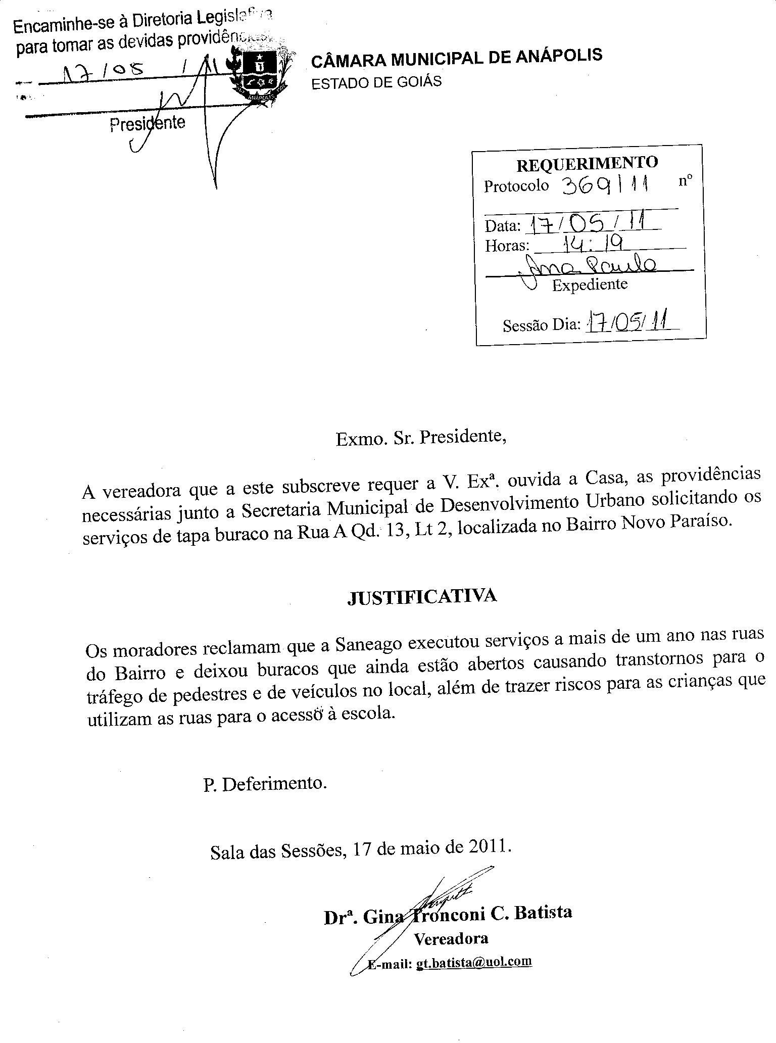 Ementa: A VEREADORA QUE A ESTE SUBSCREVE REQUER A V.EXª. OUVIDA A CASA, AS PROVIDÊNCIAS NECESSÁRIAS JUNTO A SECRETARIA MUNICIPAL DE DESENVOLVIMENTO URBANO SOLICITANDO OS SERVIÇOS DE TAPA BURACO NA RUA A QD.13, LT.2, LOCALIZADA NO BAIRRO NOVO PARAÍSO.