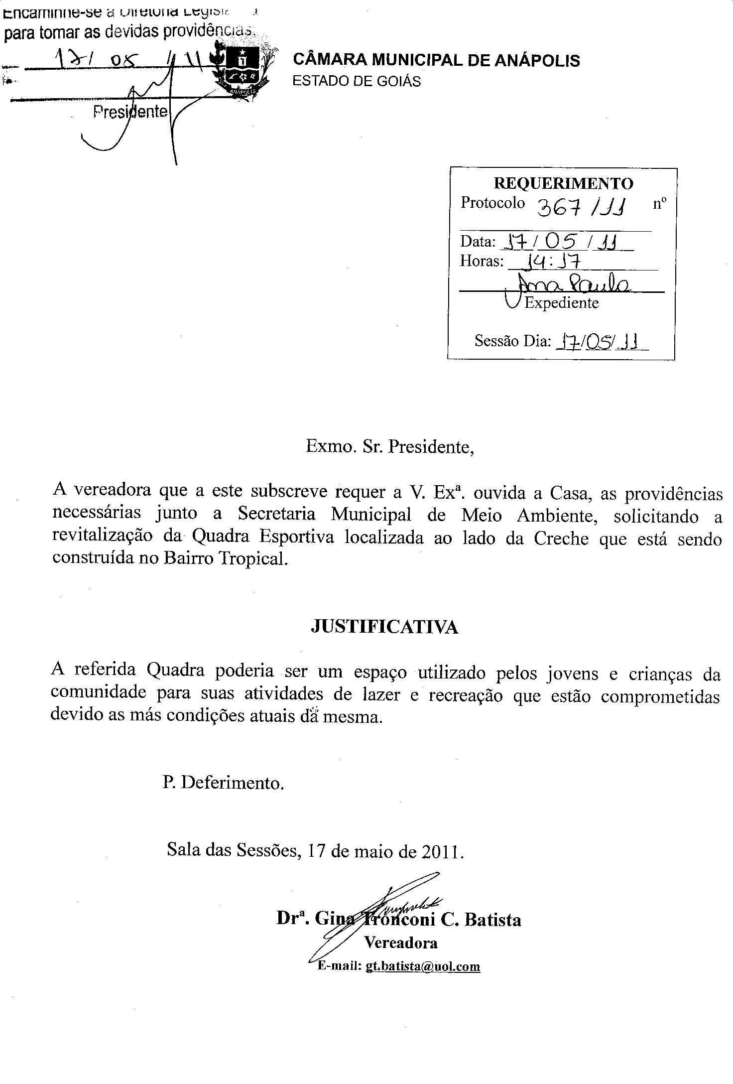 Ementa: A VEREADORA QUE A ESTE SUBSCREVE REQUER A V. EXª. OUVIDA A CASA, AS PROVIDÊNCIAS NECESSÁRIAS JUNTO A SECRETARIA MUNICIPAL DE MEIO AMBIENTE, SOLICITANDO A REVITALIZAÇÃO DA QUADRA ESPORTIVA LOCALIZADA AO LADO DA CRECHE QUE ESTÁ SENDO CONSTRUÍDA NO BAIRRO TROPICAL.