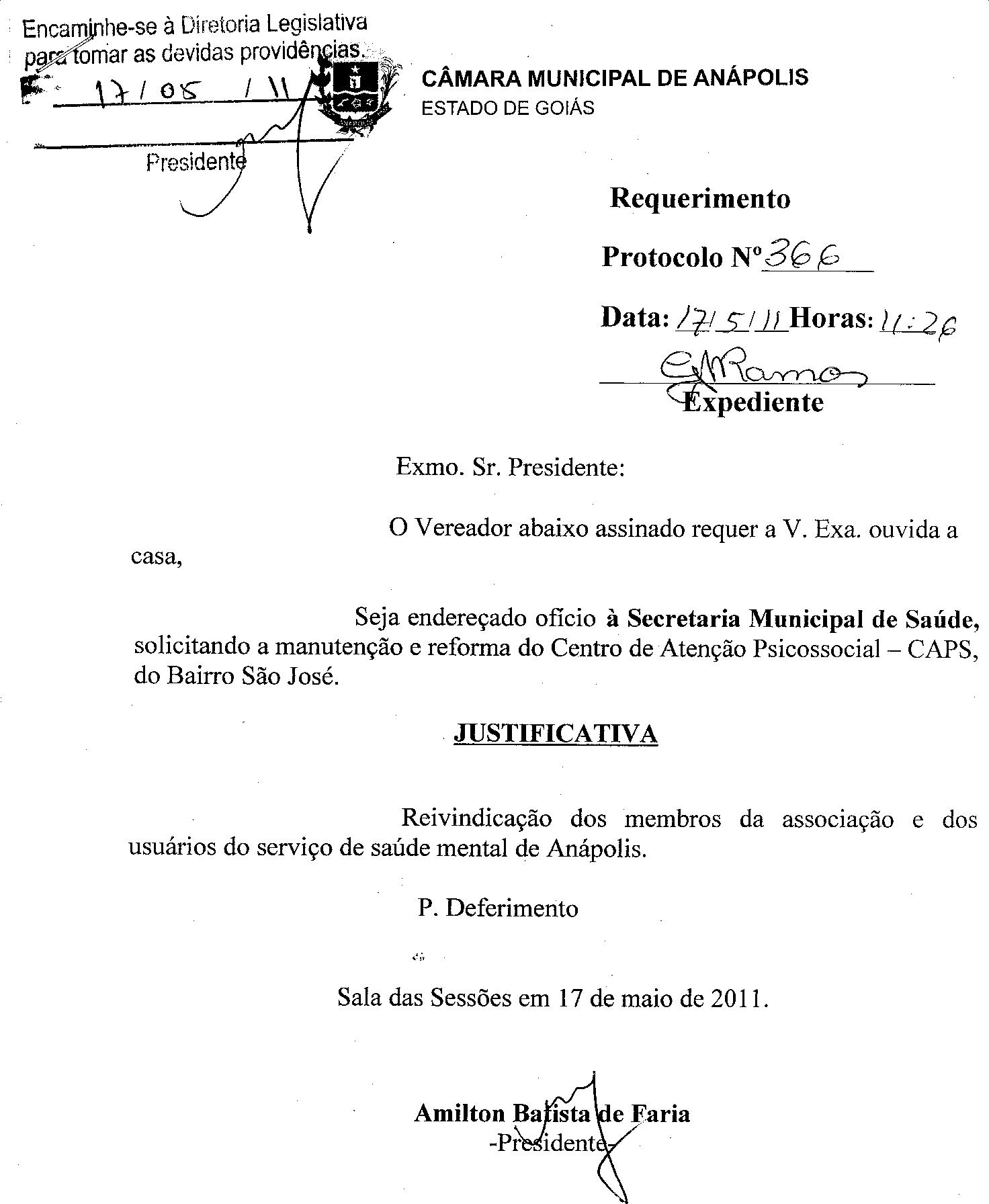 Ementa: O VEREADOR ABAIXO ASSINADO REQUER A V.EXA. OUVIDA A CASA, SEJA ENDEREÇADO OFÍCIO À SECRETARIA MUNICIPAL DE SAÚDE, SOLICITANDO A MANUTENÇÃO E REFORMA DO CENTRO DE ATENÇÃO PSICOSSOCIAL - CAPS, DO BAIRRO SÃO JOSÉ.