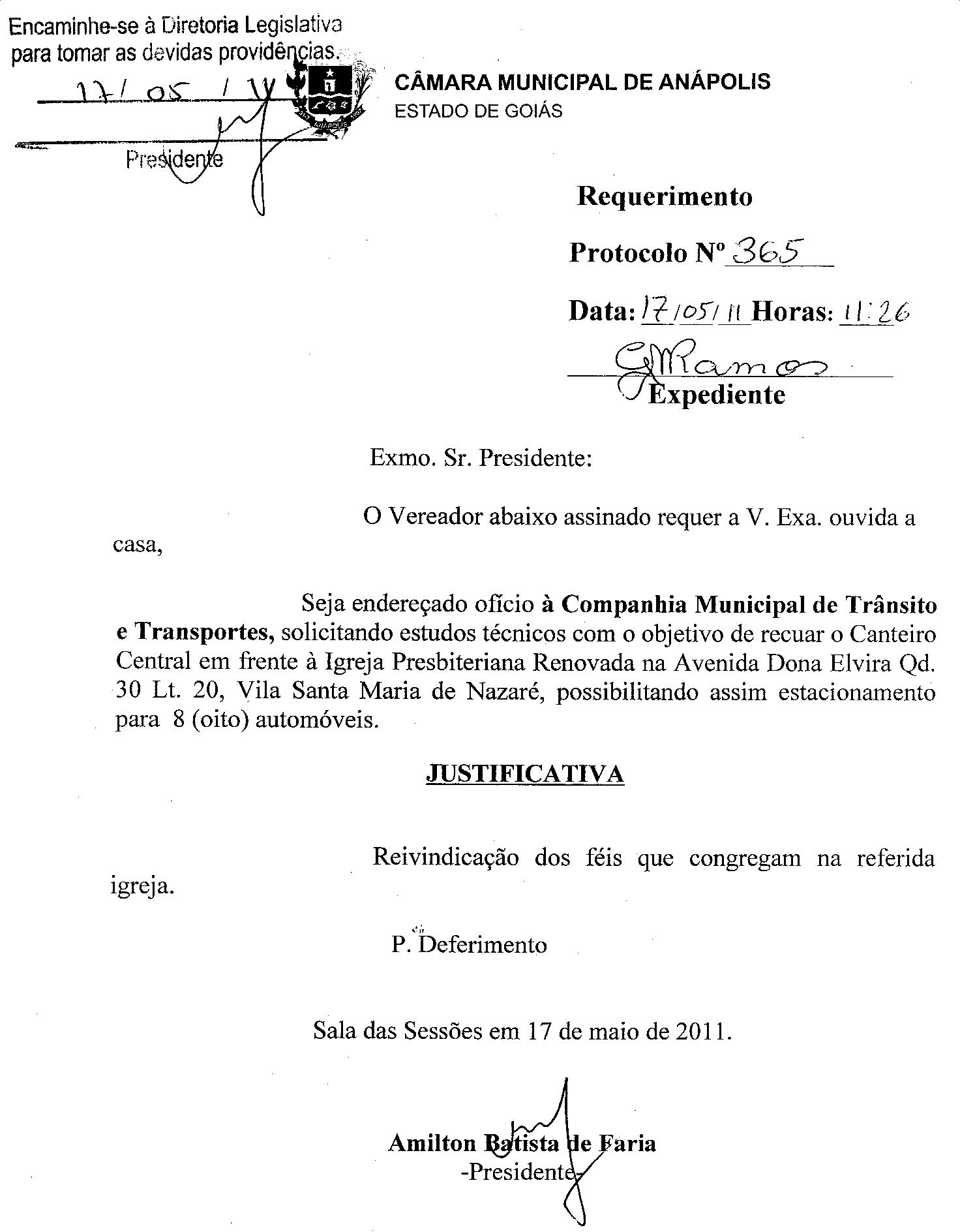 Ementa: O VEREADOR ABAIXO ASSINADO REQUER A V.EXA. OUVIDA A CASA, SEJA ENDEREÇADO OFÍCIO À COMPANHIA MUNICIPAL DE TRÂNSITO E TRANSPORTES, SOLICITANDO ESTUDOS TÉCNICOS COM O OBJETIVO DE RECUAR O CANTEIRO CENTRAL EM FRENTE À IGREJA PRESBITERIANA RENOVADA NA AVENIDA DONA ELVIRA QD. 30 LT. 20, VILA SANTA MARIA DE NAZARÉ, POSSIBILITANDO ASSIM ESTACIONAMENTO PARA 8 (OITO) AUTOMÓVEIS.