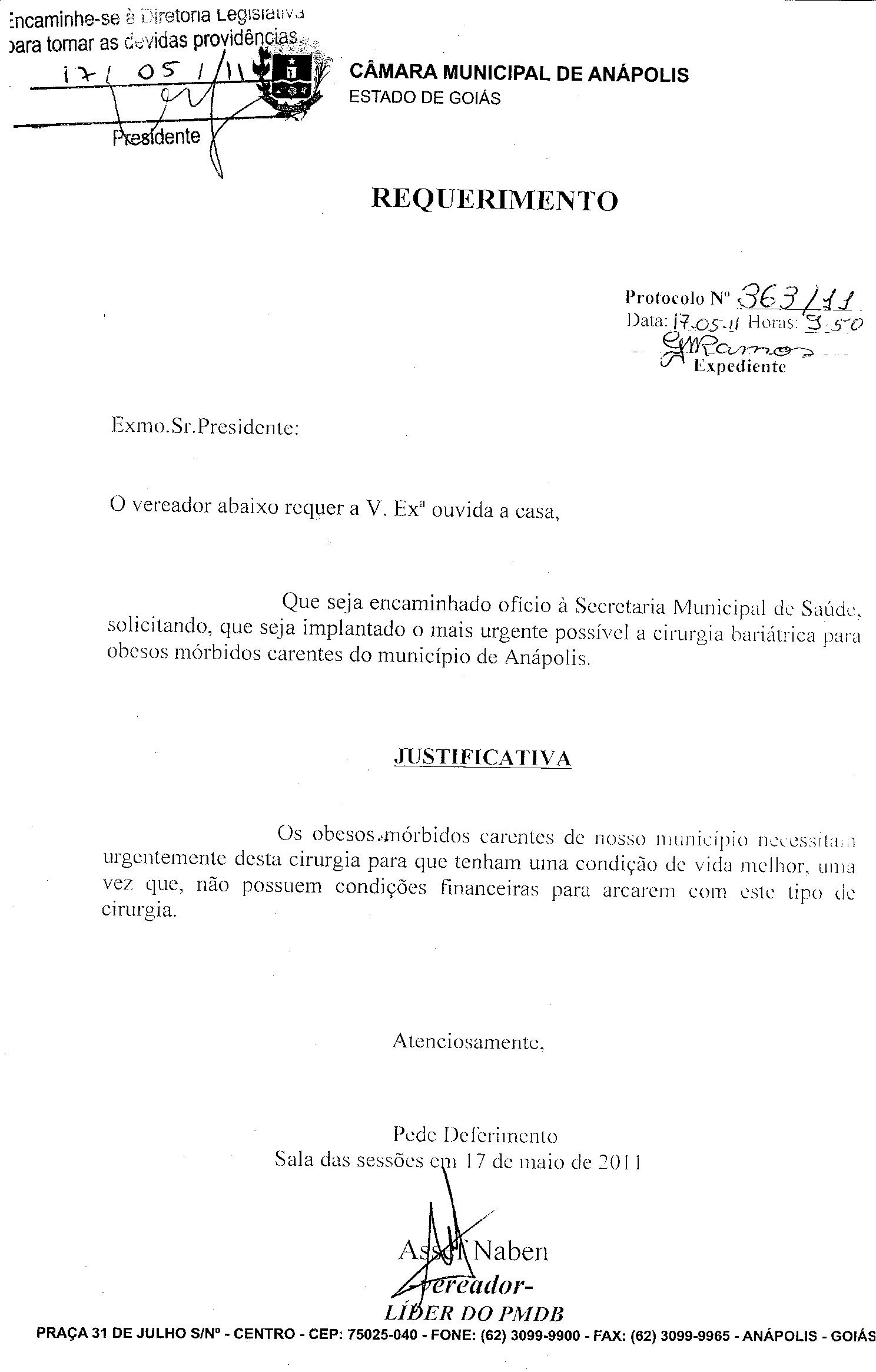 Ementa: O VEREADOR ABAIXO REQUER A V.EXª OUVIDA A CASA, QUE SEJA ENCAMINHADO OFÍCIO À SECRETARIA MUNICIPAL DE SAÚDE, SOLICITANDO, QUE SEJA IMPLANTADO O MAIS URGENTE POSSÍVEL A CIRURGIA BARIÁTRICA PARA OBESOS MÓRBIDOS CARENTE DO MUNICÍPIO DE ANÁPOLIS.
