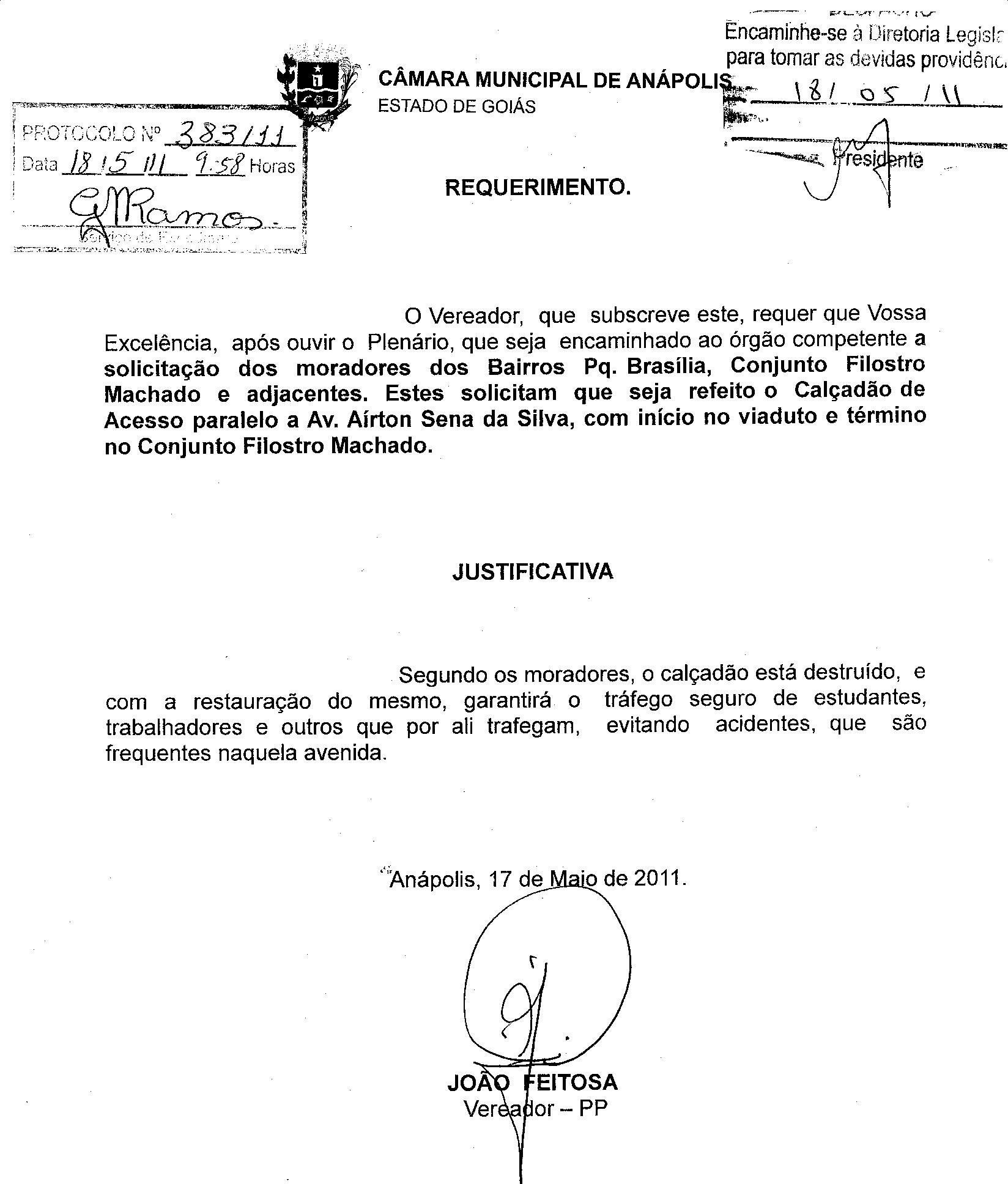 Ementa: O VEREADOR, QUE SUBSCREVE ESTE, REQUER QUE VOSSA EXCELÊNCIA, APÓS OUVIR O PLENÁRIO, QUE SEJA ENCAMINHADO AO ÓRGÃO COMPETENTE A SOLICITAÇÃO DOS MORADORES DOS BAIRROS PQ.BRASÍLIA, CONJUNTO FILOSTRO MACHADO E ADJACENTES. ESTES SOLICITAM QUE SEJA REFEITO O CALÇADÃO DE ACESSO PARALELO A AV. AÍRTON SENA DA SILVA, COM INÍCIO NO VIADUTO E TÉRMINO NO CONJUNTO FILOSTRO MACHADO.