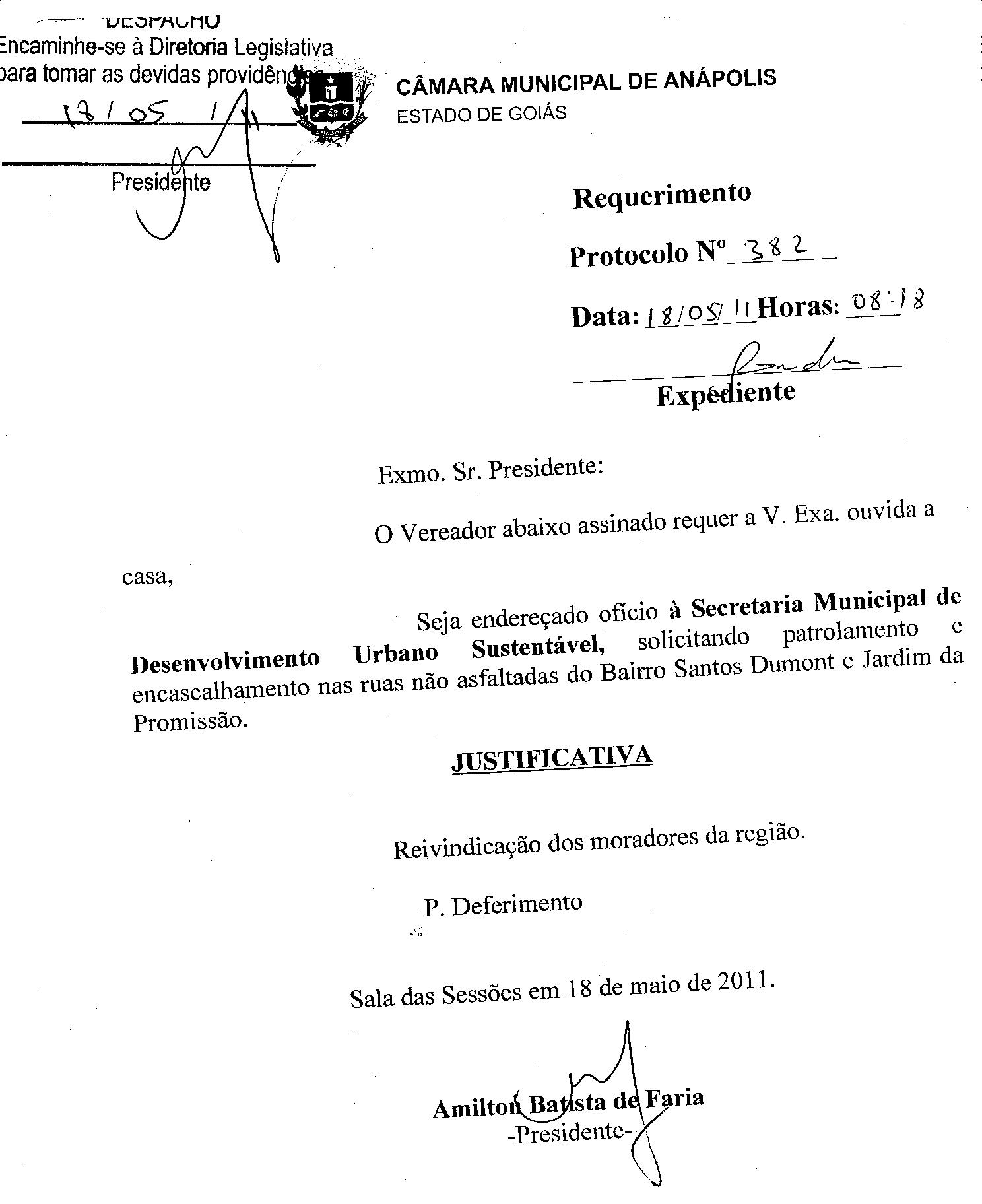 Ementa: O VEREADOR ABAIXO ASSINADO REQUER A V.EXA. OUVIDA A CASA, SEJA ENDEREÇADO OFÍCIO À SECRETARIA MUNICIPAL DE DESENVOLVIMENTO URBANO SUSTENTÁVEL, SOLICITANDO PATROLAMENTO E ENCASCALHAMENTO NAS RUAS NÃO ASFALTADAS DO BAIRRO SANTOS DUMONT E JARDIM DA PROMISSÃO.