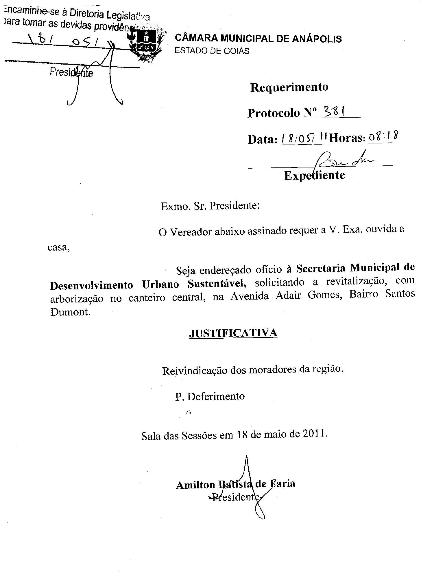 Ementa: O VEREADOR ABAIXO ASSINADO REQUER A V. EXA. OUVIDA A CASA, SEJA ENDEREÇADO OFÍCIO À SECRETARIA MUNICIPAL DE DESENVOLVIMENTO URBANO SUSTENTÁVEL, SOLICITANDO A REVITALIZAÇÃO, COM ARBORIZAÇÃO NO CANTEIRO CENTRAL, NA AVENIDA ADAIR GOMES, BAIRRO SANTOS DUMONT.
