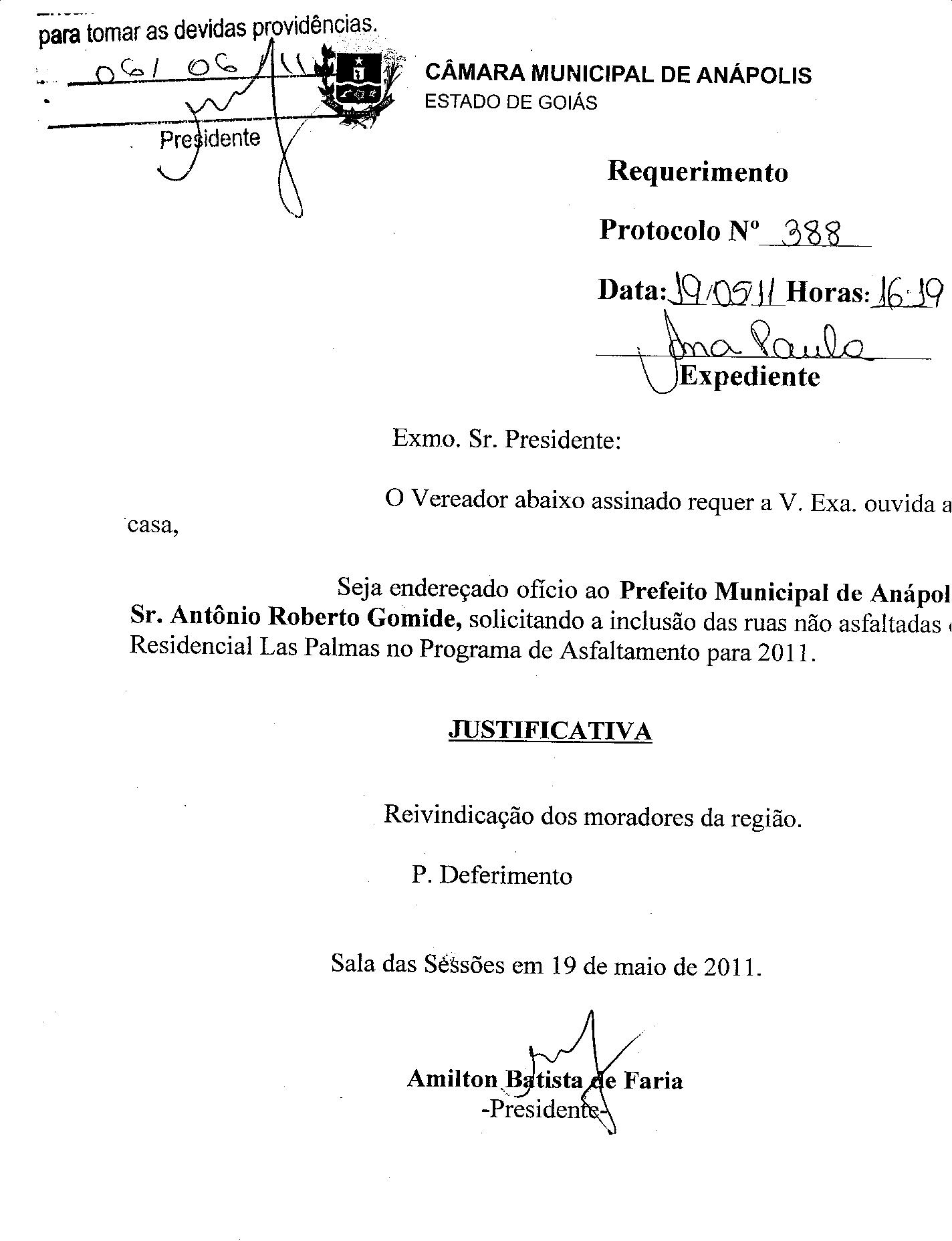 Ementa: O VEREADOR ABAIXO ASSINADO REQUER A V.EXA. OUVIDA A CASA, SEJA ENDEREÇADO OFÍCIO AO PREFEITO MUNICIPAL DE ANÁPOLIS, SR. ANTÔNIO ROBERTO GOMIDE, SOLICITANDO A INCLUSÃO DAS RUAS NÃO ASFALTADAS DO RESIDENCIAL LAS PALMAS NO PROGRAMA DE ASFALTAMENTO PARA 2011.