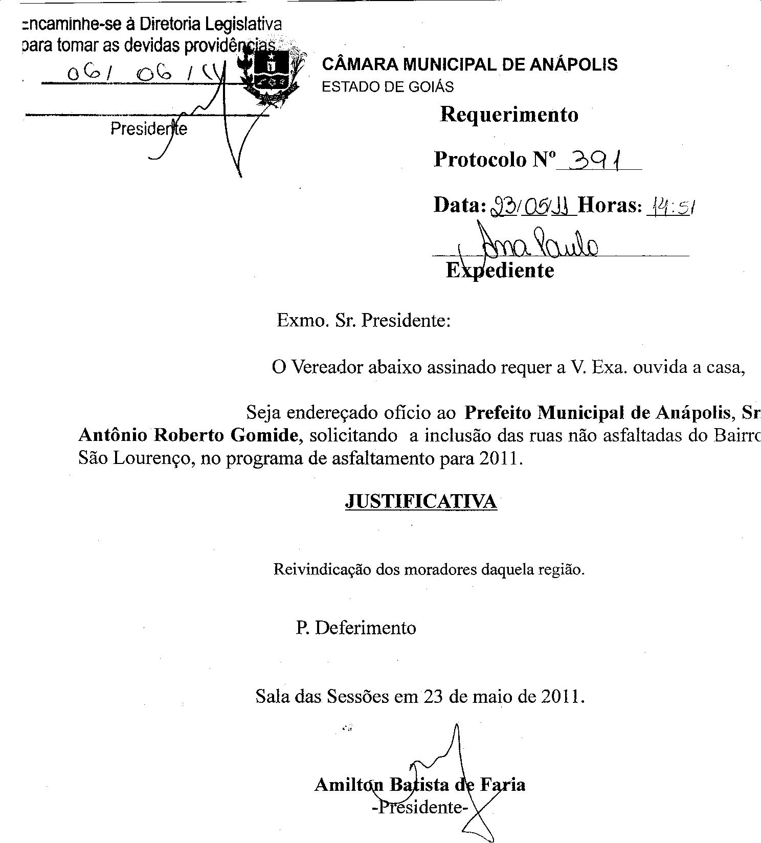 Ementa: O VEREADOR ABAIXO ASSINADO REQUER A V.EXA. OUVIDA A CASA, SEJA ENDEREÇADO OFÍCIO AO PREFEITO MUNICIPAL DE ANÁPOLIS, SR.ANTÔNIO ROBERTO GOMIDE, SOLICITANDO A INCLUSÃO DAS RUAS NÃO ASFALTADAS DO BAIRRO SÃO LOURENÇO, NO PROGRAMA DE ASFALTAMENTO PARA 2011.