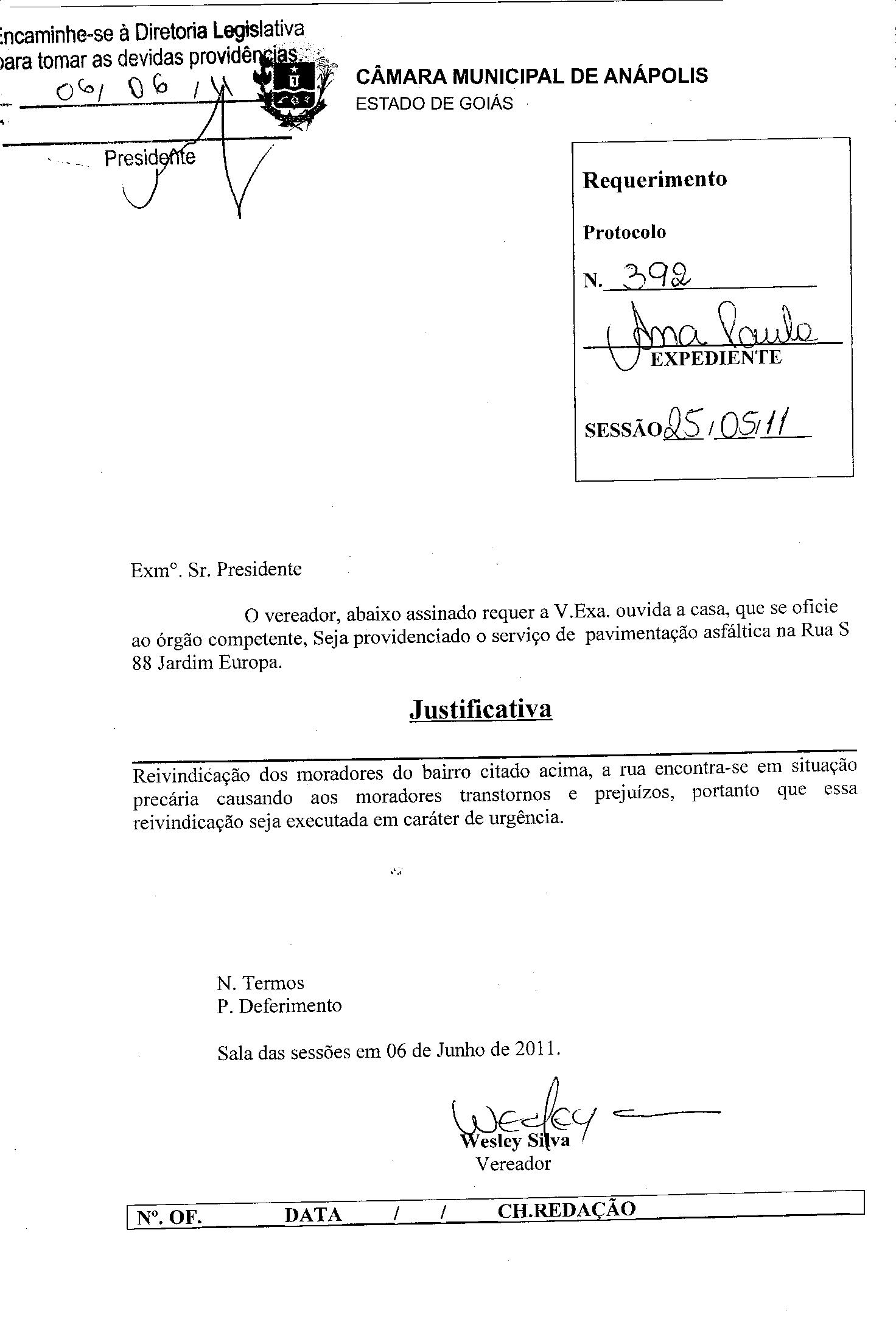 Ementa: O VEREADOR, ABAIXO ASSINADO REQUER A V.EXA. OUVIDA A CASA, QUE SE OFÌCÍE AO ÓRGAO COMPETENTE, SEJA PROVIDENCIADO O SERVIÇO DE PAVIMENTAÇÃO AS FÁTICA NA RUA S 88 JARDIM EUROPA.