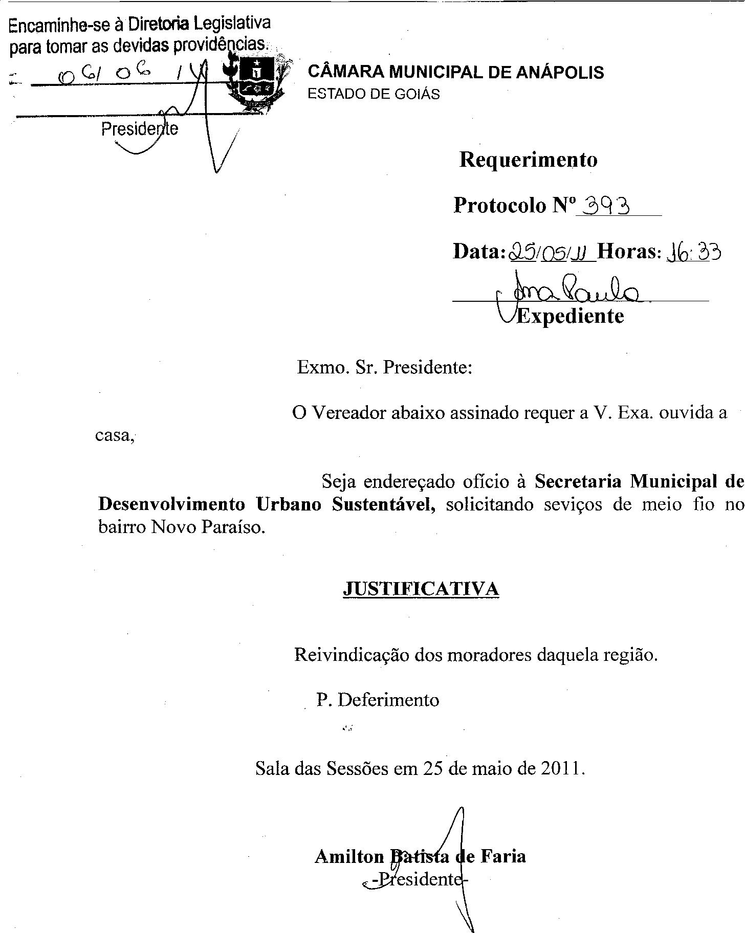 Ementa: O VEREADOR ABAIXO ASSINADO REQUER A V.EXA. OUVIDA A CASA, SEJA ENDEREÇADO OFÍCIO Á SECRETARIA MUNICIPAL DE DESENVOLVIMENTO URBANO SUSTENTÁVEL, SOLICITANDO SERVIÇOS DE MEIO FIO NO BAIRRO NOVO PARAÍSO.