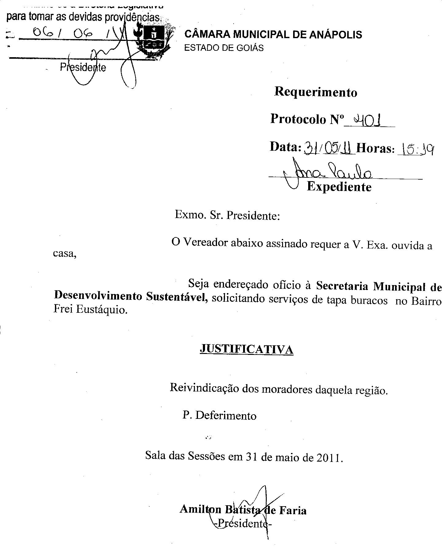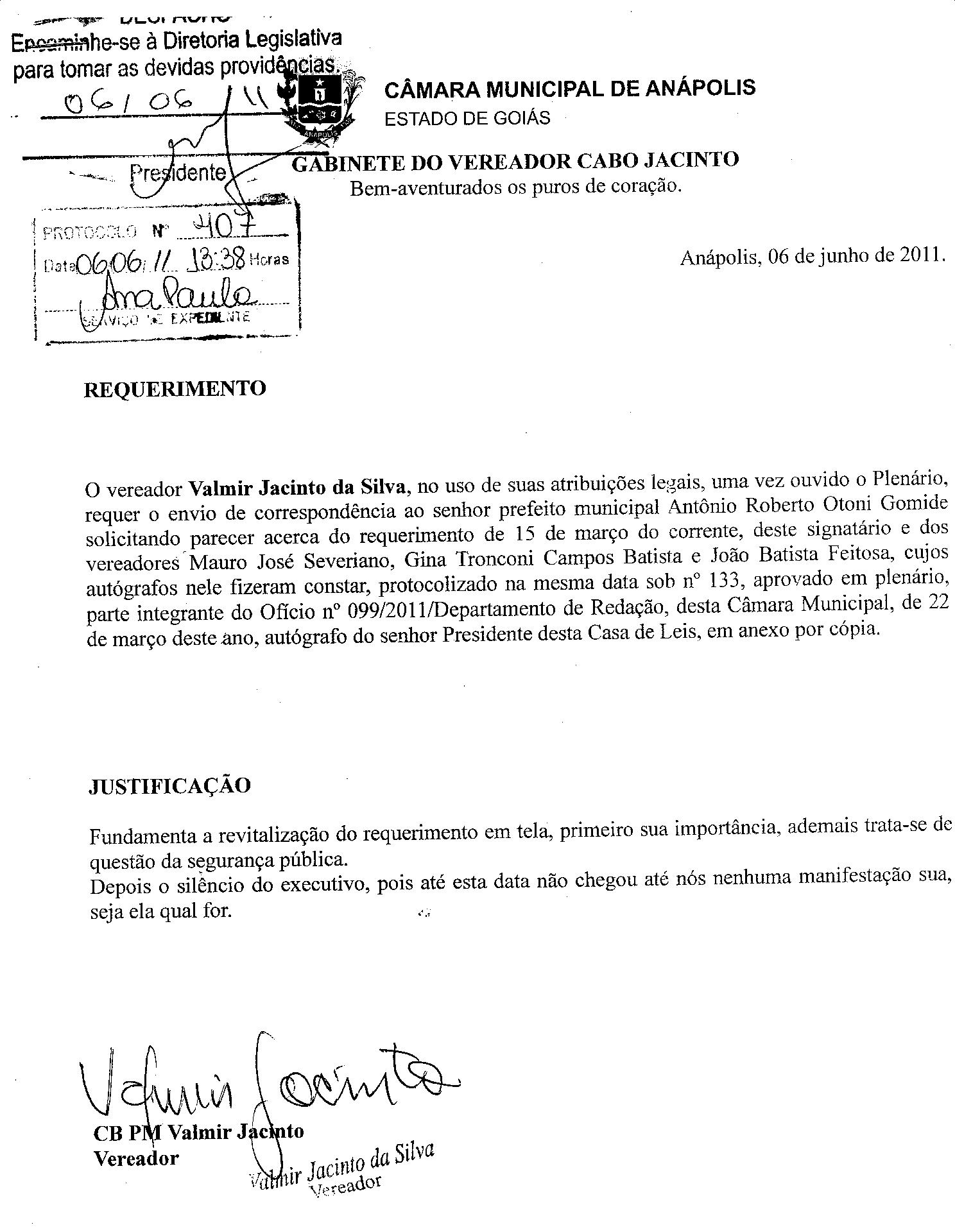 Ementa: O VEREADOR VALMIR JACINTO DA SILVA, NO USO DE SUAS ATRIBUIÇÕES LEGAIS, UMA VEZ OUVIDO O PLENÁRIO, REQUER O ENVIO DE CORRESPONDÊNCIA AO SENHOR PREFEITO MUNICIPAL ANTÔNIO ROBERTO OTONI GOMIDE SOLICITANDO PARECER ACERCA DO REQUERIMENTO DE 15 DE MARÇO DO CORRENTE, DESTE SIGNATÁRIO E DOS VEREADORES MAURO JOSÉ SEVERIANO, GINA TRONCONI CAMPOS BATISTA E JÕAO BATISTA FEITOSA, CUJOS AUTÓGRAFOS NELE FIZERAM CONSTAR, PROTOCOLIZADO NA MESMA DATA SOB Nº 133, APROVADO EM PLENÁRIO, PARTE INTEGRANTE DO OFÍCIO Nº 099/2011/DEPARTAMENTO DE REDAÇÃO, DESTA CÂMARA MUNICIPAL , DE 22 DE MARÇO DESTE ANO, AUTÓGRAFO DO SENHOR PRESIDENTE DESTA CASA DE LEIS, EM ANEXO POR CÓPIA.