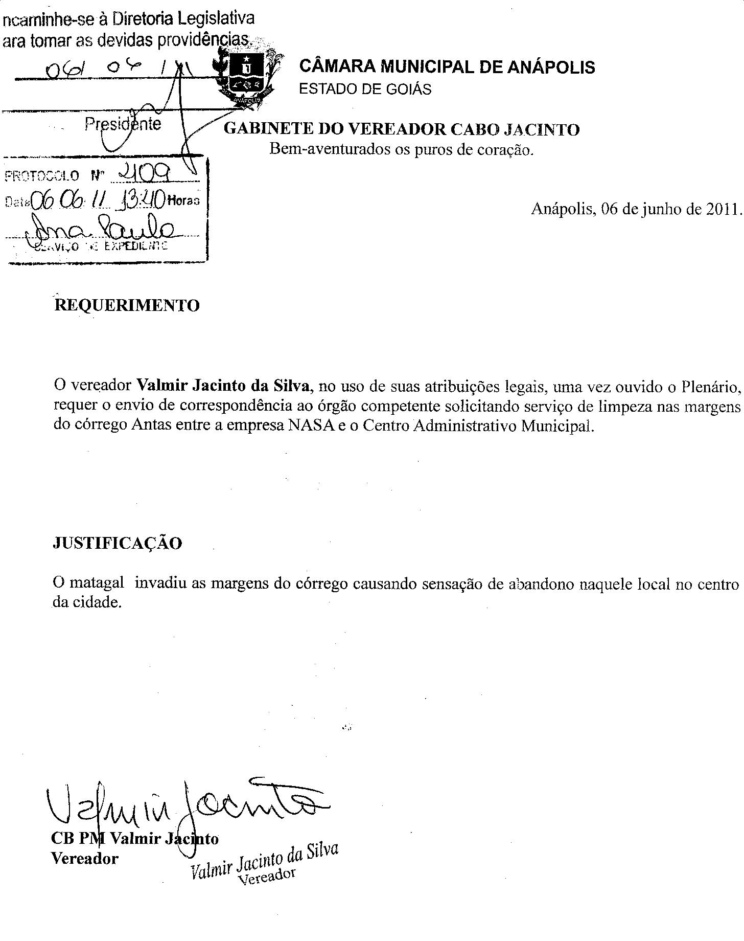 Ementa: O VEREADOR VALMIR JACINTO DA SILVA, NO USO DE SUAS ATRIBUIÇÕES LEGAIS, UMA VEZ OUVIDO O PLENÁRIO, REQUER O ENVIO DE CORRESPONDÊNCIA AO ÓRGÃO COMPETENTE SOLICITANDO SERVIÇO DE LIMPEZA NAS MARGENS DO CÓRREGO ANTAS ENTRE A EMPRESA NASA E O CENTRO ADMINISTRATIVO MUNICIPAL.