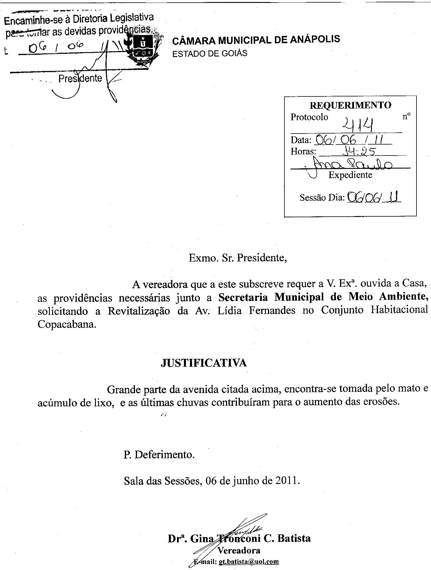 Ementa: A VEREADORA QUE A ESTE SUBSCREVE REQUER A V.EXª. OUVIDA A CASA, AS PROVIDÊNCIAS NECESSÁRIAS JUNTO A SECRETARIA MUNICIPAL DE MEIO AMBIENTE, SOLICITANDO A REVITALIZAÇÃO DA AV. LÍDIA FERNANDES NO CONJUNTO HABITACIONAL COPACABANA.