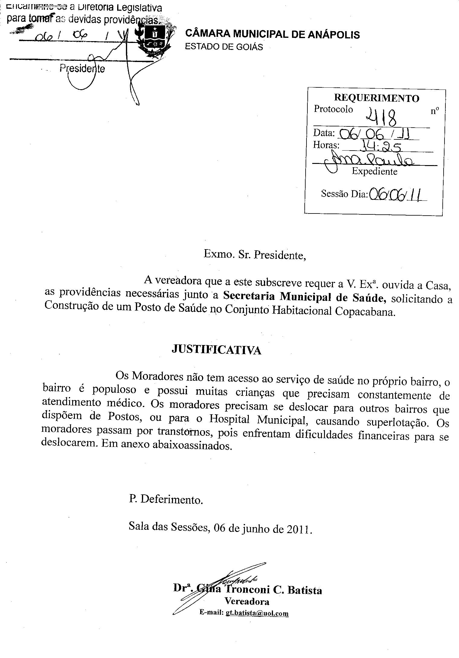 Ementa: A VEREADORA QUE A ESTE SUBSCREVE REQUER A V.EXª. OUVIDA A CASA, AS PROVIDÊNCIAS NECESSÁRIAS JUNTO A SECRETARIA MUNICIPAL DE SAÚDE, SOLICITANDO A CONSTRUÇÃO DE UM POSTO DE SAÚDE NO CONJUNTO HABITACIONAL COPACABANA.