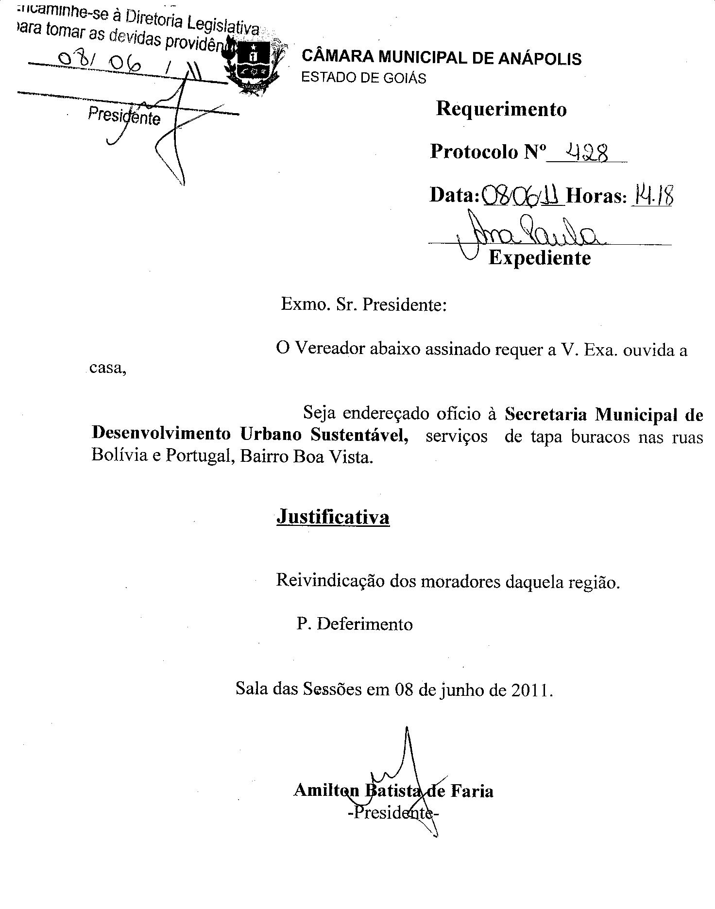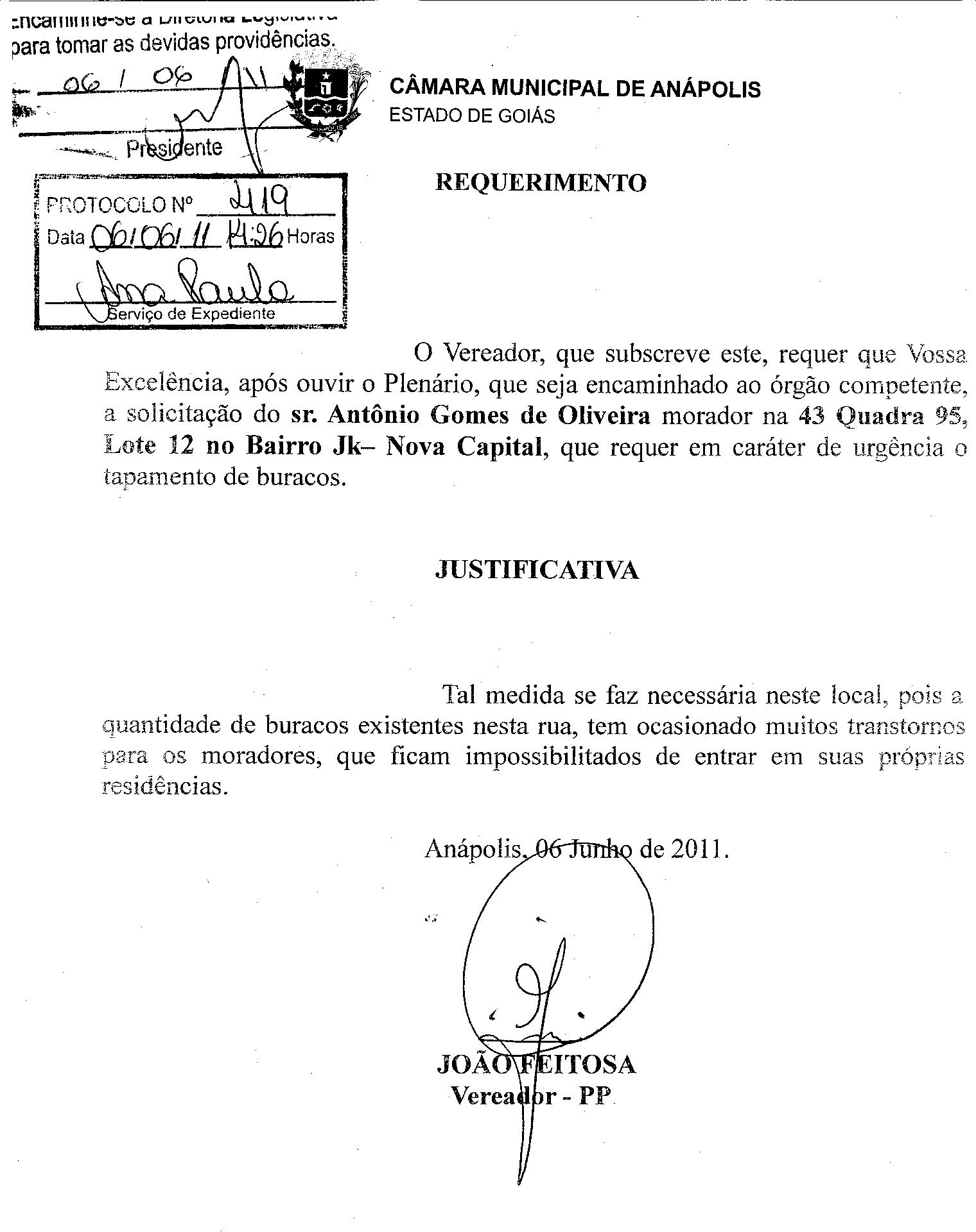 Ementa: O VEREADOR, QUE SUBSCREVE ESTE, REQUER VOSSA EXCELÊNCIA, APÓS OUVIR O PLENÁRIO, QUE SEJA ENCAMINHANDO AO ÓRGÃO COMPETENTE, A SOLICITAÇÃO DO SR. ANTÔNIO GOMES DE OLIVEIRA MORADOR NA 43 QUADRA 95, LOTE 12 NO BAIRRO JK- NOVA CAPITAL, QUE REQUER EM CARÁTER DE URGÊNCIA O TAPAMENTO DE BURACOS.