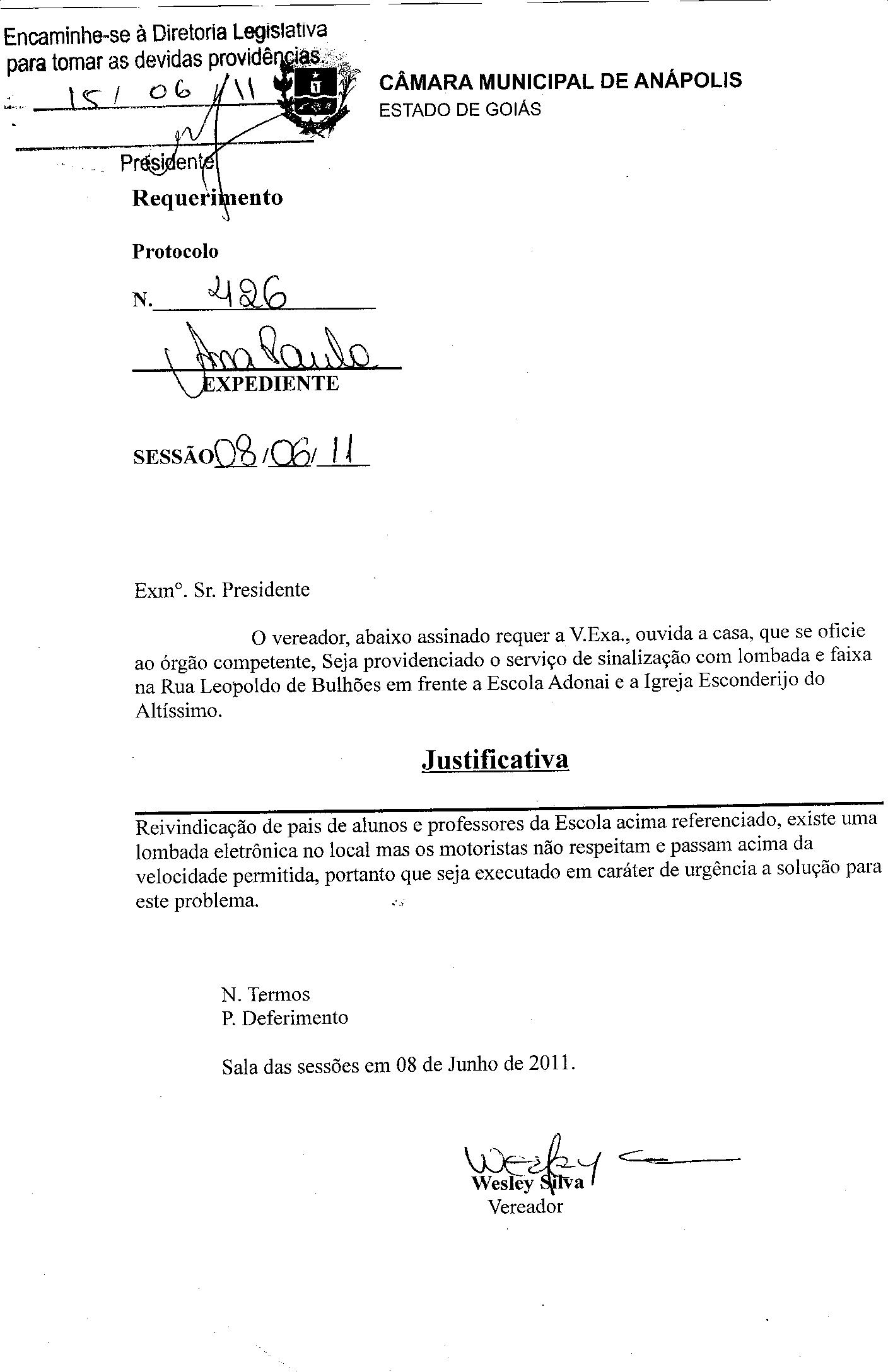 Ementa: O VEREADOR, ABAIXO ASSINADO REQUER A V.EXA., OUVIDA A CASA, QUE SE OFÍCIE AO ÓRGÃO COMPETENTE, SEJA PROVIDENCIDAO O SERVIÇO DE SINALIZAÇÃO COM LOMBADA E FAIXA NA RUA LEOPOLDO DE BULHÕES EM FRENTE A ESCOLA ADONAI E A IGREJA ESCONDERIJO DO ALTÍSSIMO.